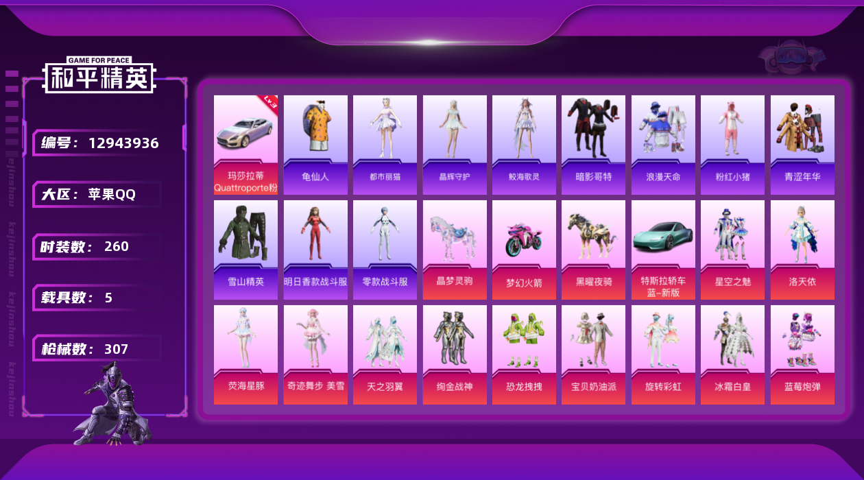 [12943936]无敌战神框/【暑期末清货/特价急出/永久包赔】:苹果 手Q-24粉装-12特效枪-5载具-12.1w热力值-16印记-260套装-307枪皮【热门品类】:套装-赤蝎幽灵,套装-深海小丑鱼,套装-胖达圆圆,套装-金羽特工,套装-暗夜行者,套装-动感兔斯基人偶服【稀有载具】:特斯拉Roadster(水滴蓝),玛莎拉蒂Quattroporte(幻星粉),双人摩托-梦幻火箭,晶梦灵驹,黑曜夜骑【稀有载具等级】:玛莎拉蒂Quattroporte(幻星粉)(三级)【特效枪等级】:AKM-梦之光华(一级),AKM-星际浪客(七级),SCAR-L-青春物语(五级),M416-五爪金龙(一级),M416-暖熊萌萌(七级),M416-灵猫魔法师(三级),GROZA-旋转彩虹(五级),AUG-妙趣可丽(五级),M762-甜蜜誓约(七级),Vector-灵感创作师(五级),P90-甜蜜草莓(六级),Kar98K-巳巳如意(一级)【优质套装】:粉装-数码大师,粉装-宝贝奶油派,粉装-雪国幻梦,粉装-梦幻火箭,粉装-星空之魅,粉装-草莓生巧,粉装-绚金战神,粉装-银刃赛罗,粉装-冰霜白皇,粉装-炙焰红王,角色-洛天依,角色-2号机款机体服,粉装-蓝莓炮弹,粉装-天之羽翼,粉装-海盐物语,粉装-恐龙拽拽,粉装-闪耀律动,角色-复仇流浪者,粉装-旋转彩虹,粉装-冰川红玫,粉装-第五大道,角色-绯月迷踪,角色-荧海星豚,角色-奇迹舞步 美雪【优质飞行器】:酣梦熊熊飞行器,梦幻火箭飞行器,马卡龙飞行器,天之羽翼飞行器,灵感创作师飞行器,灵猫魔法师飞行器