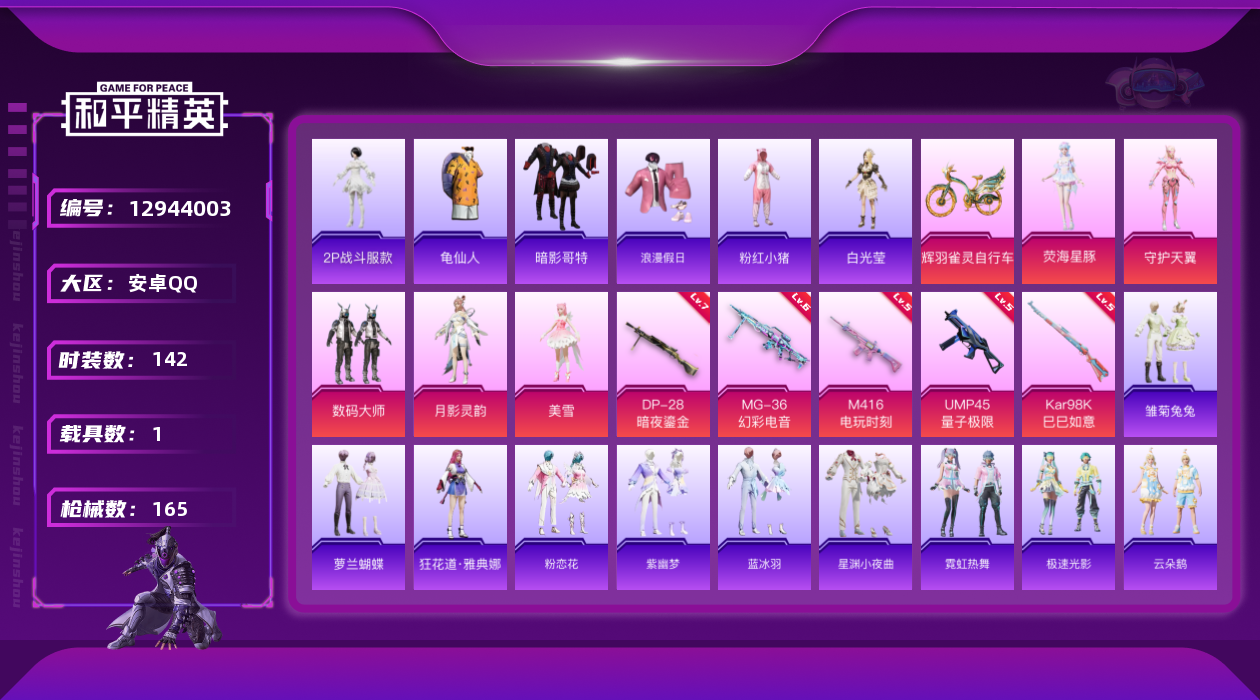 [12944003]老101【暑期末清货/特价急出/永久包赔】:安卓 手Q-5粉装-5特效枪-1载具-5.2w热力值-12印记-142套装-165枪皮【热门品类】:套装-火箭少女101,角色-2P战斗服款【稀有载具】:辉羽雀灵自行车【特效枪等级】:M416-电玩时刻(五级),UMP45-量子极限(五级),Kar98K-巳巳如意(五级),DP-28-暗夜鎏金(七级),MG3-辉羽雀灵(六级MG-36-幻彩电音)【优质套装】:粉装-数码大师,角色-美雪,角色-守护天翼,角色-月影灵韵,角色-荧海星豚【优质飞行器】:超新星飞行器