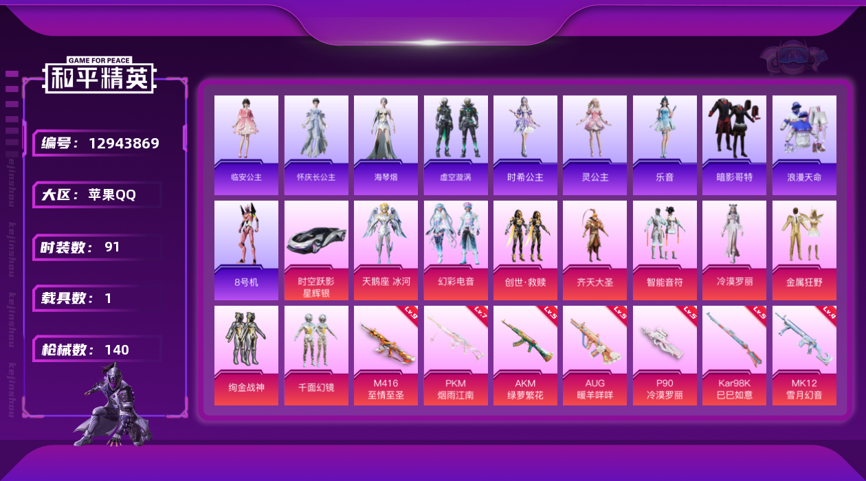 [12943869]地铁满天赋/M416-至情至圣(九级)【暑期末清货/特价急出/永久包赔】:苹果 手Q-9粉装-7特效枪-1载具-4.7w热力值-2印记-91套装-140枪皮【稀有载具】:时空跃影(星辉银)【特效枪等级】:AKM-绿萝繁花(五级),M416-至情至圣(九级),AUG-暖羊咩咩(五级),P90-冷漠罗丽(五级),Kar98K-巳巳如意(五级),MK12-雪月幻音(四级),PKM-江南烟雨(七级)【优质套装】:粉装-金属狂野,粉装-智能音符,粉装-绚金战神,粉装-齐天大圣,粉装-千面幻镜,套装-创世·救赎,角色-天鹅座 冰河,粉装-幻彩电音,角色-冷漠罗丽【优质飞行器】:齐天大圣飞行器,繁龙极客飞行器,霓虹漫游飞行器,万象金身飞行器