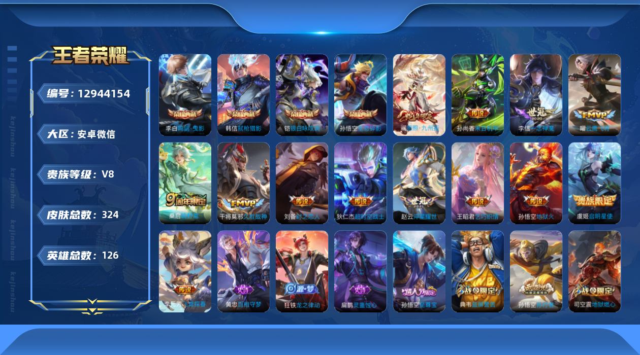 [12944154]安卓WX-V8-至尊星耀I段位-126英雄-324皮肤-4典藏-0珍品无双-0无双-0珍品传说-13传说-90史诗