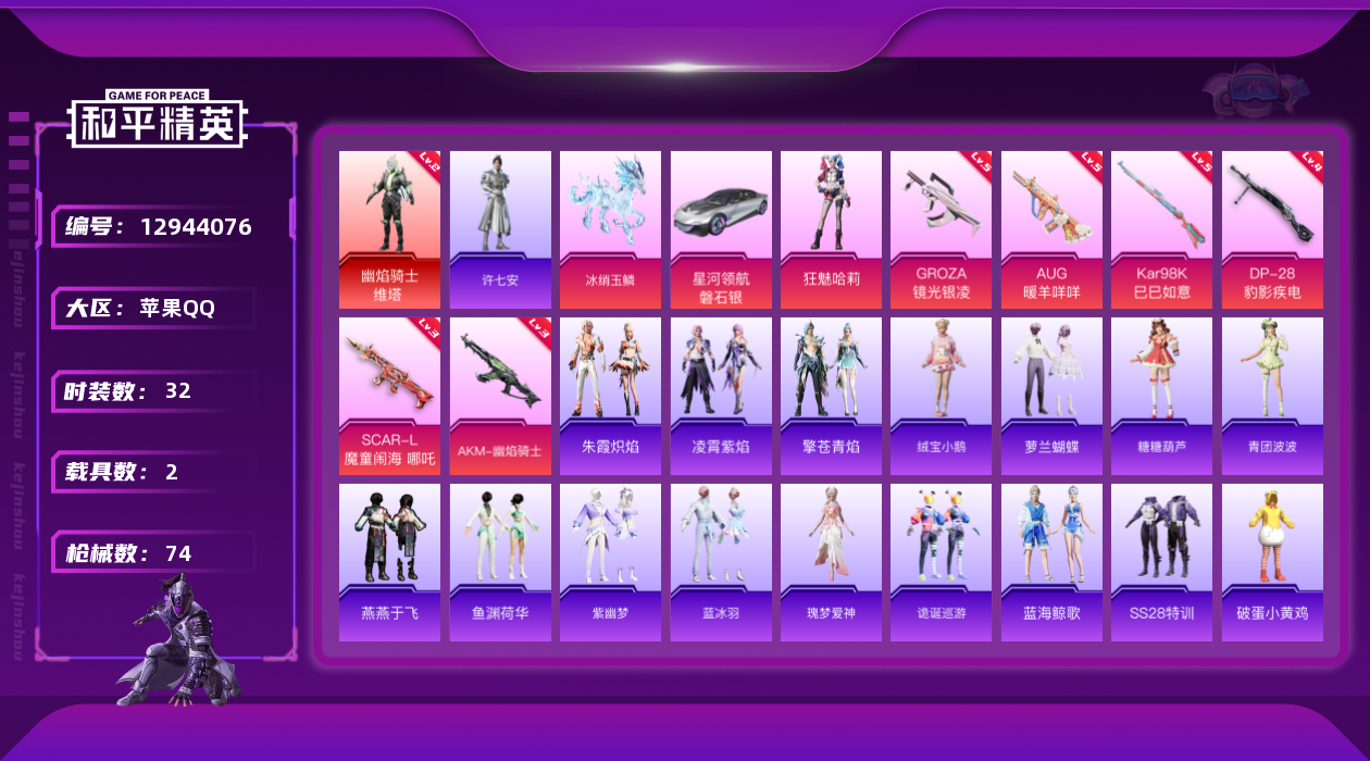 [12944076]苹果 手Q-1神装-1粉装-6特效枪-2载具-2粉色飞行器-25828热力值-2王牌印记-32套装-74枪皮