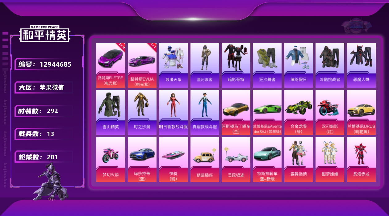 [12944685]连体王者:小国标关羽!v10-451皮9典藏+武则天3无双2珍品74传说战神框!4级路特斯!木乃伊!雪国!黄螳螂新101巧克力三姐妹追光队服沙漠守护者!苹果 微信-无敌战神框-49粉装-19特效枪-13载具-13粉色飞行器-148720热力值-18王牌印记-292套装-281枪皮 !!! 【红色载具】:路特斯ELETRE(电光紫)(四级),路特斯EVIJA(电光紫)(一级) 【热门品类】:粉装-雪国幻梦,粉装-梦幻火箭,粉装-童趣迷兔,套装-浪漫天命,套装-都市猎人,套装-冥河战士,套装-深海小丑鱼,套装-奇异狩猎者,套装-胖达团团,套装-胖达圆圆,套装-金羽特工,套装-沙漠守护者,套装-忍者信条,套装-星河浪客,套装-动感兔斯基人偶服,套装-SS1特训,套装-潮萌小黄鸭,套装-暗影哥特,套装-浪漫波比,小恶魔头饰,熔岩游骑兵面罩,熔岩游骑兵连帽夹克 【粉色载具】:特斯拉Roadster(水滴蓝),兰博基尼Aventador SVJ(翡翠绿),兰博基尼URUS(明艳黄),阿斯顿马丁DBS(金),路特斯EVIJA(电光紫),路特斯ELETRE(电光紫),玛莎拉蒂Ghibli(蓝),合金龙骨(绿),灵鼠银迹,萌喵橘座,双人摩托-梦幻火箭,双人摩托-双刃魅影(红),空客H135-蔚蓝之翼,快艇-塞莎KL27(霓虹粉) 【粉色套装】:粉装-荒野猎神,粉装-银河战甲,粉装-甜心巧克力,粉装-宝贝奶油派,粉装-天使彩虹糖,粉装-火曜朱雀,粉装-水曜玄武,粉装-金曜白虎,粉装-雪国幻梦,粉装-蝶舞迷情,粉装-梦幻火箭,粉装-金风玉露,粉装-PEL轰鸣竞梦者,粉装-新星烈龙,粉装-迷蝶贵族,粉装-绚金战神,粉装-冰霜白皇,粉装-童趣迷兔,粉装-炙焰红王,粉装-暗翼战神,粉装-王牌四分卫,粉装-绮梦青鸾,粉装-星之彼岸,粉装-相思残雪,粉装-馨动时刻,粉装-炙焰赤龙,粉装-蜜桃特工,粉装-铁血龙王,粉装-显圣真君,粉装-彩虹鹿灵,粉装-沙场疾风,粉装-吟月归客,角色-零号机款机体服,粉装-甜心娃娃,粉装-酣梦娃娃,粉装-暗星紫秘,粉装-天之羽翼,粉装-焦糖拿铁,粉装-海盐物语,粉装-恐龙拽拽,粉装-庄周梦蝶,粉装-橘柚倾心,粉装-冷魅冰骑,粉装-赤焰黑爵,粉装-紫电风暴,粉装-灵感创作师,粉装-太空嘟嘟,粉装-千面幻镜,角色-冷漠罗丽 【粉色枪皮等级】:AKM-甜心宝贝(五级),A