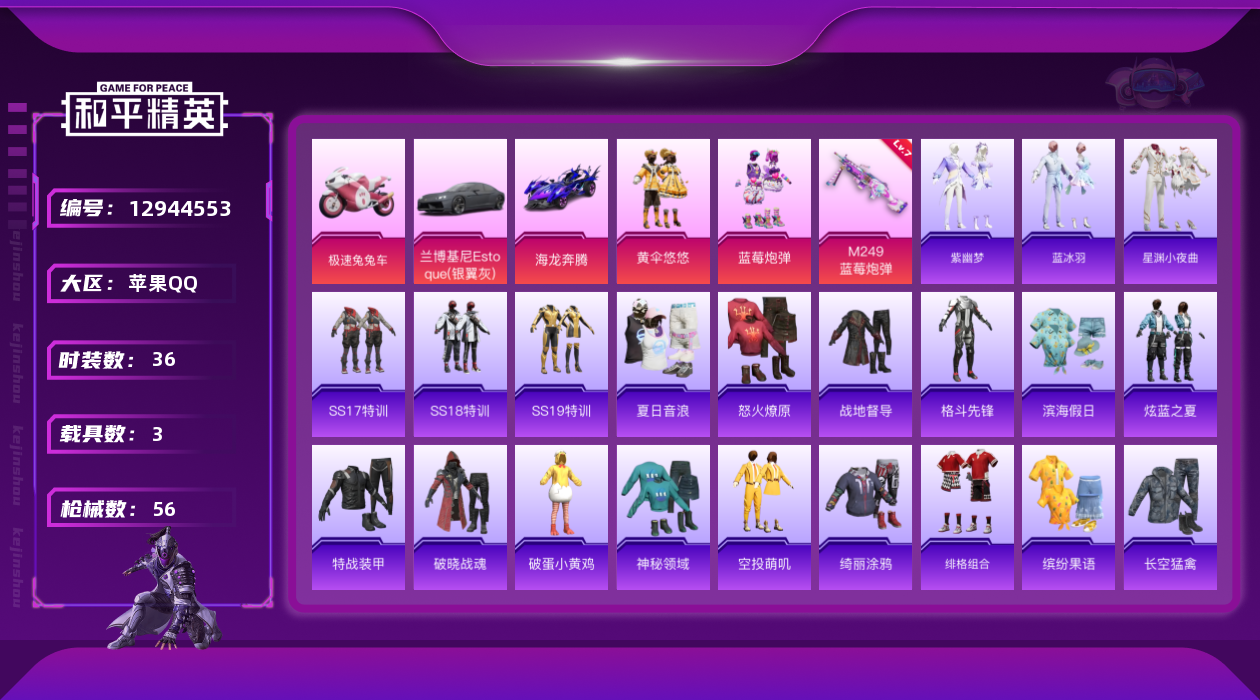 [12944553]【暑期末清货/特价急出/永久包赔】:苹果 手Q-2粉装-1特效枪-3载具-1.9w热力值-1印记-36套装-56枪皮【稀有载具】:兰博基尼Estoque(银翼灰),海龙奔腾,极速兔兔车【特效枪等级】:M249-蓝莓炮弹(七级)【优质套装】:粉装-黄伞悠悠,粉装-蓝莓炮弹