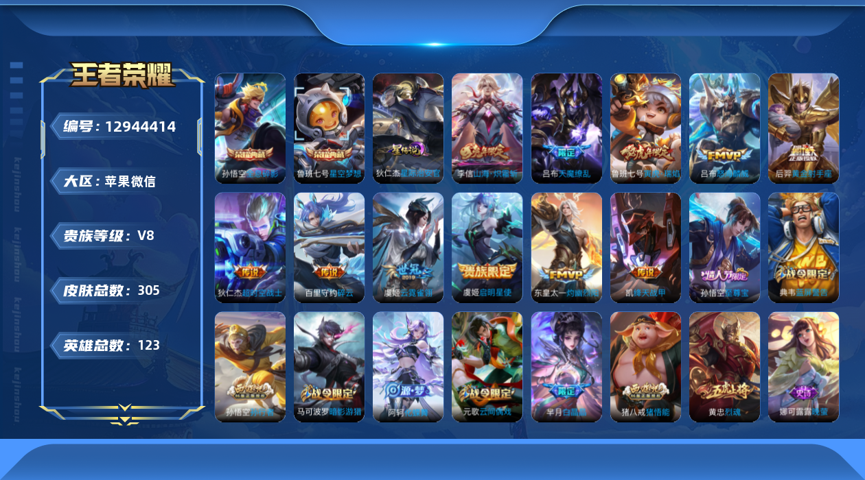 [12944414]苹果WX-V8-尊贵铂金III段位-123英雄-305皮肤-2典藏-0珍品无双-0无双-0珍品传说-11传说-89史诗
