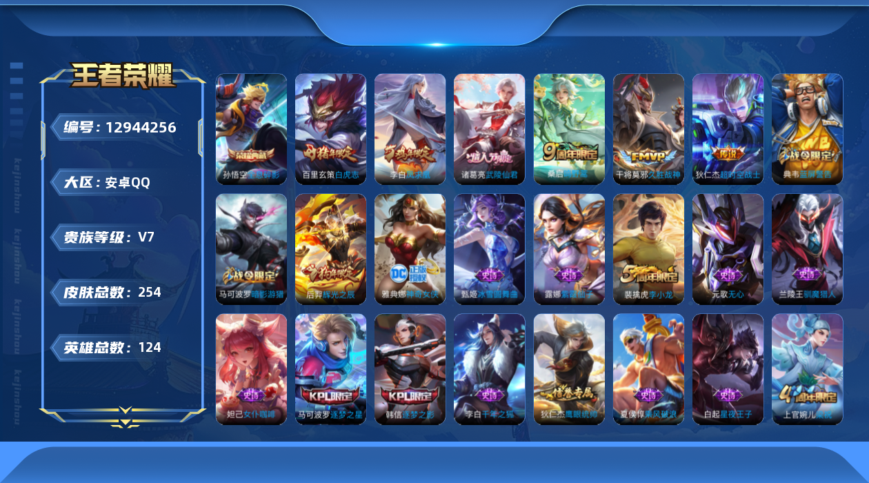 [12944256]安卓Q-V7-至尊星耀I段位-124英雄-254皮肤-1典藏-0珍品无双-0无双-0珍品传说-6传说-51史诗 【荣耀典藏】:孙悟空全息碎影 【传说皮肤】:桑启鸣野蒿,干将莫邪久胜战神,百里玄策白虎志,诸葛亮武陵仙君,李白凤求凰,狄仁杰超时空战士 【限定皮肤】:白起狰,狄仁杰阴阳师,虞姬凯尔特女王,赵云皇家上将,嬴政白昼王子,鲁班七号狮舞东方,高渐离死亡摇滚,阿轲迷踪丽影,钟无艳超时空战士,芈月重明,吕布猎兽之王,周瑜赤莲之焰,元歌无心,夏侯惇朔风刀,甄姬落雪兰心,曹操烛龙,典韦穷奇,典韦蓝屏警告,马可波罗逐梦之星,马可波罗暗影游猎,狄仁杰魔术师,狄仁杰万华元夜,达摩沙漠行僧,项羽海滩派对,老夫子醍醐杖,程咬金演武夺筹,刘邦夺宝奇兵,韩信逐梦之影,兰陵王驯魔猎人,兰陵王金庭之子,牛魔御旌,后羿辉光之辰,李元芳银河之约,李元芳云中旅人,钟馗神迹守卫,钟馗驱傩正仪,女娲朔望之晖,雅典娜单词大作战,雅典娜黎明之约,蔡文姬繁星吟游,太乙真人饕餮,太乙真人华丽摇滚,鬼谷子原初探秘者,诸葛亮武陵仙君,百里玄策白虎志,百里玄策原初追逐者,弈星混沌棋,梦奇顽趣,沈梦溪星空之诺,沈梦溪大漠名商,明世隐疑决卦,裴擒虎李小龙,裴擒虎擒涛扼浪,狂铁御狮,米莱狄御霄,盾山御銮,猪八戒西部大镖客,上官婉儿梁祝,蒙犽狂想玩偶喵,鲁班大师探海日志,桑启海盐诗旅,艾琳女武神,阿古朵江河有灵,张良古海寻踪,蒙恬荣光圣徽,鬼谷子天穹祈灯,刘邦剑破天穹 【年限皮肤】:百里玄策白虎志,李白凤求凰,后羿辉光之辰 【赛季限定】:白起狰,芈月重明,夏侯惇朔风刀,曹操烛龙,典韦穷奇,狄仁杰万华元夜,达摩沙漠行僧,老夫子醍醐杖,程咬金演武夺筹,兰陵王金庭之子,张良古海寻踪,牛魔御旌,李元芳云中旅人,虞姬凯尔特女王,钟馗驱傩正仪,雅典娜黎明之约,太乙真人饕餮,鬼谷子原初探秘者,百里玄策原初追逐者,弈星混沌棋,梦奇顽趣,沈梦溪大漠名商,明世隐疑决卦,裴擒虎擒涛扼浪,狂铁御狮,米莱狄御霄,盾山御銮,鲁班大师探海日志,桑启海盐诗旅,鬼谷子天穹祈灯,蒙恬荣光圣徽,刘邦剑破天穹 【战令限定】:嬴政白昼王子,鲁班七号狮舞东方,阿轲迷踪丽影,钟无艳超时空战士,吕布猎兽之王,周瑜赤莲之焰,甄姬落雪兰心,典韦蓝屏警告,马可波罗暗影游猎,刘邦夺宝奇兵,兰陵王驯魔猎人,李元芳银河之约,钟馗神迹守卫,女娲朔望之晖,雅典娜单词大作战,沈梦溪星