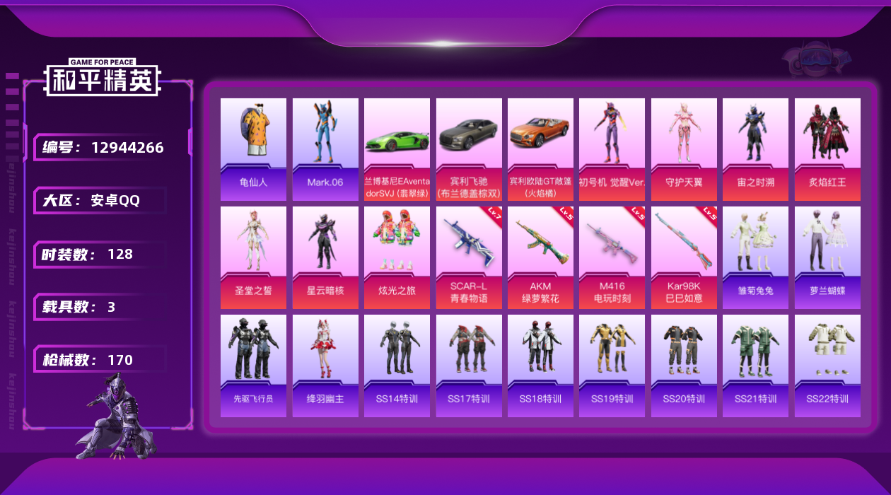[12944266]【暑期末清货/特价急出/永久包赔】:安卓 手Q-7粉装-4特效枪-3载具-5.9w热力值-11印记-128套装-170枪皮【热门品类】:套装-深海小丑鱼,套装-奇异狩猎者【稀有载具】:兰博基尼Aventador SVJ(翡翠绿),宾利欧陆GT敞篷(火焰橘),宾利飞驰(布罗德盖棕双色)【特效枪等级】:AKM-绿萝繁花(五级),SCAR-L-青春物语(七级),M416-电玩时刻(五级),Kar98K-巳巳如意(五级)【优质套装】:粉装-炙焰红王,粉装-炫光之旅,角色-宙之时溯,角色-星云暗核,角色-圣堂之誓,角色-守护天翼,角色-初号机 觉醒Ver.