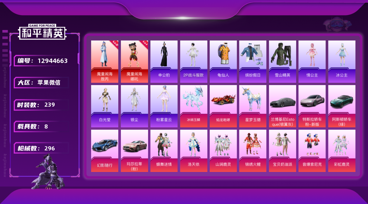 [12944663]苹果2级敖丙1级哪吒新101都市深海! 微信-2神装-18粉装-14特效枪-8载具-8粉色飞行器-125005热力值-22王牌印记-239套装-296枪皮