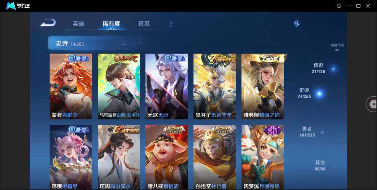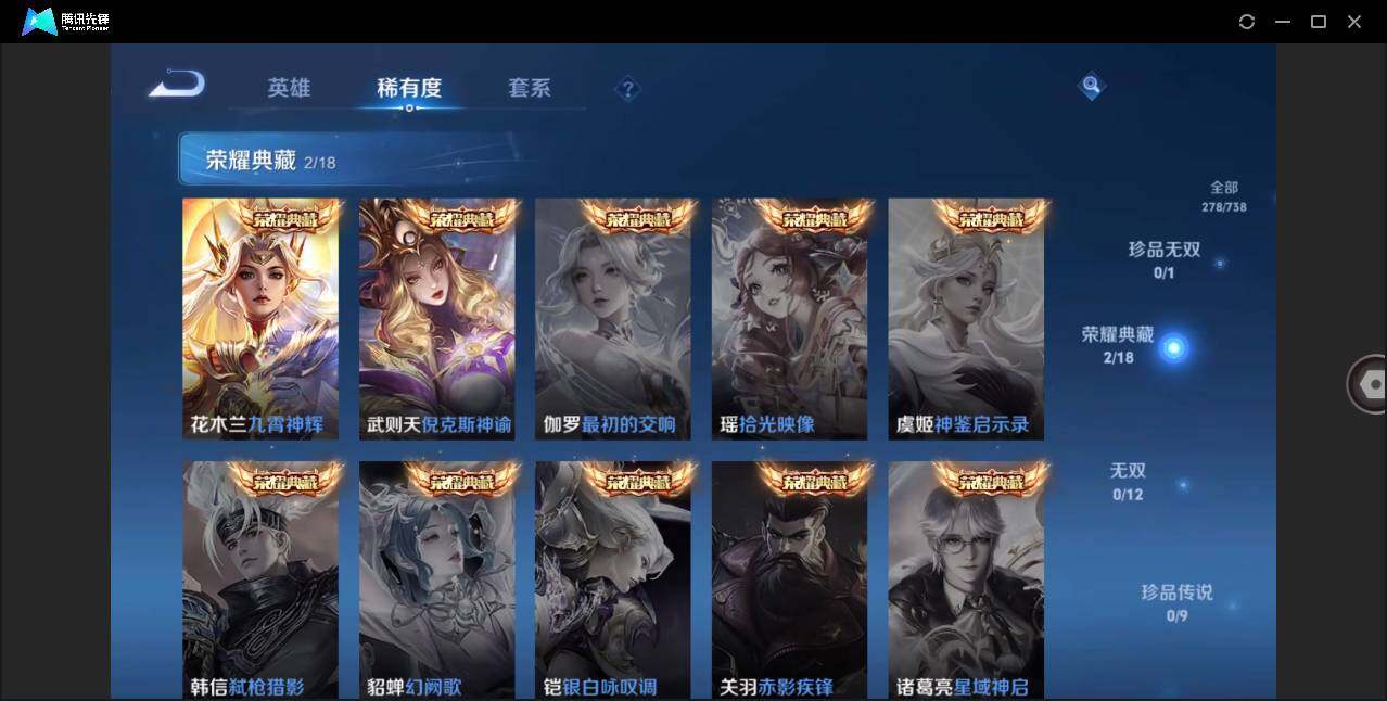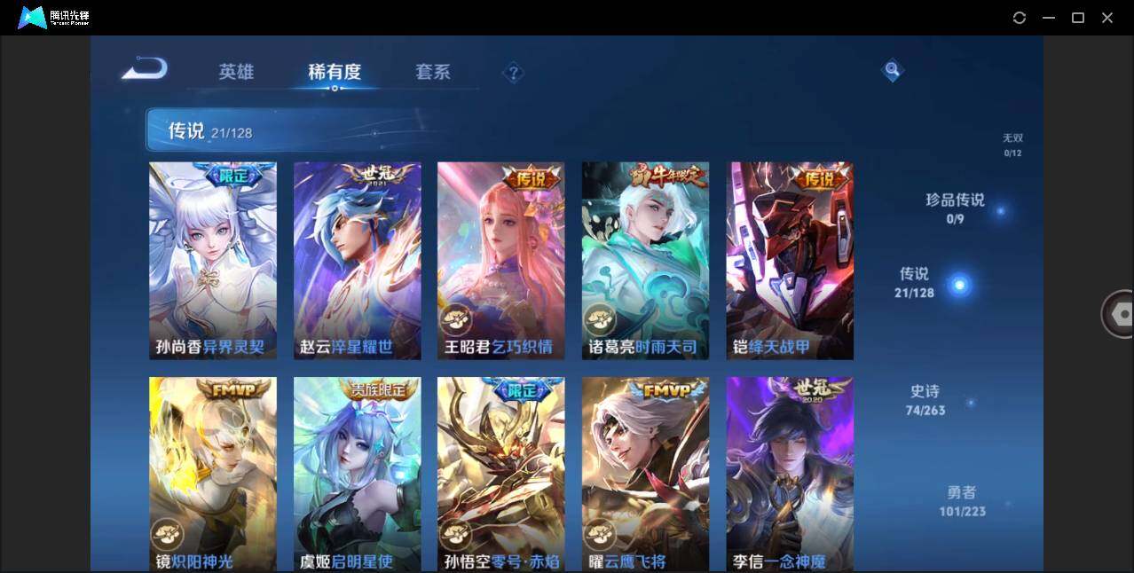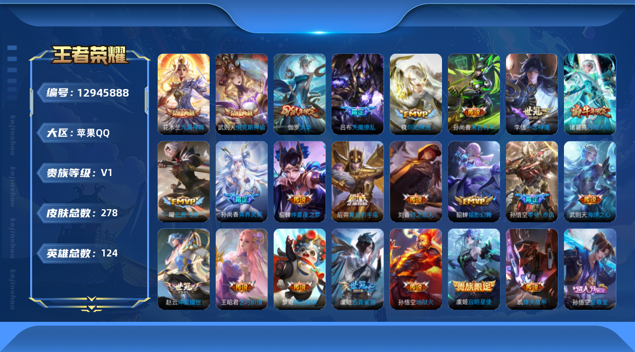 - [11968484]V7 1典藏 15传说 123英雄 301皮肤 可修改实名 优质装备:九霄神辉(木兰典藏),云鹰飞将(小将军),炽阳神光,一念神魔,地狱火,李逍遥,时之恋人-刘备(电焊工),无双飞将,霜月吟,澜逐花归海,涂山容容 传说皮:祥瑞亨通,幻光神枪 珍宝阁皮:蔷薇恋人,女武神,玩趣恶龙 限定皮:愿照·九州拓(澜年限),愿照·千秋盛(女娲年限),逐霄战戟,鸣野蒿,五谷丰年,匿光追影者,寅虎·赤拳(老虎年限),玉兔公主,山海·玄木吟(马可年限) 史诗皮:器灵·浮梦炉,糖绘人间,星界战将,谪仙醉月,龙之律动,百相守梦-周瑜,茶境仙,破空之剑,蔬乡物语(鲁班七号),超元猎域,百相守梦-百里守约,百相守梦-黄忠,紫霞仙子,特工魅影,江河有灵,雪夜绮愿(周瑜),魅语,百解令(蒙犽),高渐离燃音魔法,偶像歌手,末日机甲-吕布,猫狗日记-孙策,乱世虎臣,节奏热浪,修罗,女仆咖啡,摇滚巨星,水果甜心,星夜王子,心灵骇客,功夫厨神,德古拉伯爵,暗隐猎兽者,幽灵船长,鬼剑武藏,暗渊魔法,心灵战警,乐园奇幻夜,舞动绿茵,纤云弄巧,拒霜思,缤纷独角兽,乘风破浪,逐浪之夏,月团寄思,水晶猎龙者,曙光守护者,箭羽风息,金属风暴,圣诞狂欢,圣诞恋歌,鹰眼统帅,暗夜贵公子,魅力维加斯,赏金猎手,天秀·音浪,无心,未来纪元-赵云