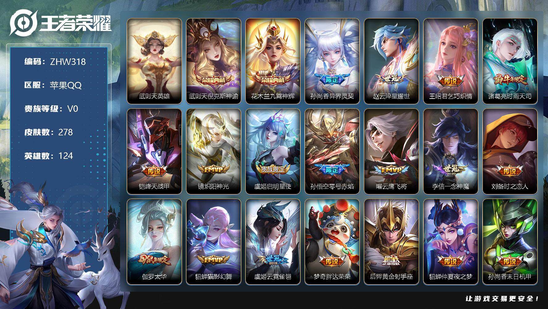 [12945888]【特价急出/详情看图】:苹果Q-V0-秩序白银II段位-124英雄-278皮肤-3典藏-21传说-74史诗 【荣耀典藏】:武则天英雄,武则天倪克斯神谕,花木兰九霄神辉 【传说皮肤】:孙尚香异界灵契,赵云淬星耀世,王昭君乞巧织情,诸葛亮时雨天司,铠绛天战甲,镜炽阳神光,虞姬启明星使,孙悟空零号赤焰,曜云鹰飞将,李信一念神魔,刘备时之恋人,伽罗太华,貂蝉猫影幻舞,虞姬云霓雀翎,梦奇胖达荣荣,后羿黄金射手座,貂蝉仲夏夜之梦,孙尚香末日机甲,孙悟空地狱火,吕布天魔缭乱,武则天海洋之心 【限定皮肤】:白起狰,狄仁杰阴阳师,虞姬凯尔特女王,赵云皇家上将,嬴政白昼王子,孙尚香异界灵契,鲁班七号狮舞东方,庄周高山流水,高渐离玩趣恶龙,吕布天魔缭乱,吕布猎兽之王,周瑜赤莲之焰,元歌云间偶戏,元歌无心,夏侯惇朔风刀,甄姬游园惊梦,典韦蓝屏警告,马可波罗暗影游猎,马可波罗山海玄木吟,狄仁杰魔术师,狄仁杰万华元夜,达摩沙漠行僧,项羽海滩派对,老夫子醍醐杖,关羽冰锋战神,程咬金演武夺筹,兰陵王驯魔猎人,亚瑟潮玩骑士王,孙悟空至尊宝,孙悟空大圣娶亲,孙悟空零号赤焰,孙悟空孙行者,牛魔御旌,后羿如梦令,后羿圣弓游侠,李元芳银河之约,李元芳云中旅人,虞姬启明星使,钟馗神迹守卫,钟馗驱傩正仪,杨玉环遇见飞天,女娲朔望之晖,干将莫邪真爱魔法,雅典娜单词大作战,雅典娜黎明之约,蔡文姬繁星吟游,太乙真人饕餮,鬼谷子原初探秘者,鬼谷子五谷丰年,诸葛亮时雨天司,黄忠烈魂,苏烈千军破阵,百里玄策原初追逐者,弈星混沌棋,沈梦溪星空之诺,明世隐疑决卦,裴擒虎李小龙,狂铁御狮,米莱狄御霄,云中君纤云弄巧,伽罗太华,盾山御銮,猪八戒西部大镖客,猪八戒猪悟能,上官婉儿梁祝,嫦娥拒霜思,嫦娥暖冬兔眠,蒙犽狂想玩偶喵,桑启海盐诗旅,张良古海寻踪,蒙犽百解令,周瑜熔金海岸 【年限皮肤】:诸葛亮时雨天司,伽罗太华,马超神威,黄忠烈魂,马可波罗山海玄木吟 【赛季限定】:白起狰,夏侯惇朔风刀,狄仁杰万华元夜,达摩沙漠行僧,老夫子醍醐杖,程咬金演武夺筹,张良古海寻踪,牛魔御旌,李元芳云中旅人,虞姬凯尔特女王,钟馗驱傩正仪,雅典娜黎明之约,太乙真人饕餮,鬼谷子原初探秘者,苏烈千军破阵,百里玄策原初追逐者,弈星混沌棋,明世隐疑决卦,狂铁御狮,米莱狄御霄,盾山御銮,桑启海盐诗旅 【战令限定】:嬴政白昼王子,鲁班七号狮舞东方,吕布猎兽之王,