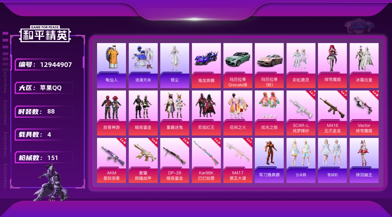 [12944907]暑期末清货/特价急出/永久包赔地铁满天赋苹果 手Q-10粉装-9特效枪-4载具-5.4w热力值-6印记-88套装-151枪皮【热门品类】:角色-军刀雅典娜【稀有载具】:玛莎拉蒂Ghibli(粉),玛莎拉蒂Grecale(薄荷绿),海龙奔腾,僚机-萌兔起飞【特效枪等级】:AKM-星际浪客(五级),SCAR-L-纯梦嫁纱(七级),M416-五爪金龙(七级),蜜獾-辉耀战甲(四级),Vector-绯穹魔姬(六级),Kar98K-巳巳如意(三级),M417-第五大道(一级),DP-28-暗夜鎏金(四级)【优质套装】:粉装-梦幻火箭,粉装-放客神游,粉装-花间之火,粉装-冰霜白皇,粉装-童趣迷兔,粉装-炙焰红王,粉装-彩虹鹿灵,粉装-暗夜鎏金,粉装-炫光之旅,角色-绯穹魔姬【优质飞行器】:天之羽翼飞行器,太空嘟嘟飞行器,星际浪客飞行器,纯梦嫁纱飞行翼,萌物绒绒飞行器