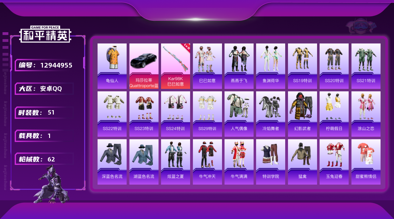[12944955]暑期末清货/特价急出/永久包赔安卓 手Q-0粉装-1特效枪-1载具-1.7w热力值-3印记-51套装-62枪皮【稀有载具】:玛莎拉蒂Quattroporte(夜幕蓝)【特效枪等级】:Kar98K-巳巳如意(五级)