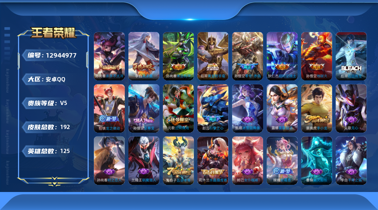 - PX_2068366-实名: 可修改 贵族等级: V8 英雄数: 121 皮肤数: 290 荣耀水晶: 鸣剑·曳影,弑枪猎影 传说皮: 黄金狮子座,云鹰飞将,炽阳神光,一念神魔,零号·赤焰,淬星耀世,山海·炽霜斩,山海·苍雷引,幻光神枪 限定皮: 冰锋战神,李小龙,游园惊梦,梁祝,时雨天司,龙胆,烈魂,岱宗,神威,凤求凰,青龙志,朱雀志,至尊宝,大圣娶亲,高山流水,孙行者,匿光追影者,傲雪梅枪,五