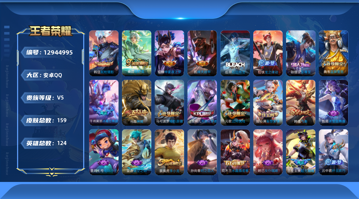 [12944995]【特价急出/详情看图】:安卓Q-V5-永恒钻石III段位-124英雄-159皮肤-1典藏-3传说-42史诗 【荣耀典藏】:韩信弑枪猎影 【传说皮肤】:桑启鸣野蒿,铠绛天战甲,貂蝉仲夏夜之梦 【限定皮肤】:狄仁杰阴阳师,赵云皇家上将,阿轲迷踪丽影,元歌云间偶戏,夏侯惇朔风刀,典韦蓝屏警告,马可波罗暗影游猎,狄仁杰魔术师,狄仁杰万华元夜,达摩星际陆战队,项羽海滩派对,老夫子醍醐杖,程咬金演武夺筹,刘邦夺宝奇兵,韩信飞衡,亚瑟潮玩骑士王,孙悟空至尊宝,牛魔御旌,李元芳银河之约,钟馗驱傩正仪,女娲朔望之晖,干将莫邪冰霜恋舞曲,雅典娜单词大作战,鬼谷子原初探秘者,苏烈千军破阵,弈星混沌棋,沈梦溪星空之诺,明世隐疑决卦,裴擒虎李小龙,狂铁御狮,米莱狄御霄,米莱狄胡桃异想国,云中君纤云弄巧,盾山御銮,猪八戒西部大镖客,上官婉儿梁祝,上官婉儿天狼绘梦者,蒙犽狂想玩偶喵,鲁班大师探海日志,张良古海寻踪,蒙犽百解令,鬼谷子天穹祈灯,姬小满妄想食味,百里玄策超元猎域,鲁班七号蔬乡物语,李元芳蔬乡物语,刘邦剑破天穹,程咬金群星魔术团 【年限皮肤】:韩信飞衡,马超神威 【赛季限定】:夏侯惇朔风刀,狄仁杰万华元夜,老夫子醍醐杖,程咬金演武夺筹,张良古海寻踪,牛魔御旌,钟馗驱傩正仪,鬼谷子原初探秘者,苏烈千军破阵,弈星混沌棋,明世隐疑决卦,狂铁御狮,米莱狄御霄,盾山御銮,鲁班大师探海日志,鬼谷子天穹祈灯,刘邦剑破天穹 【战令限定】:阿轲迷踪丽影,元歌云间偶戏,典韦蓝屏警告,马可波罗暗影游猎,达摩星际陆战队,刘邦夺宝奇兵,亚瑟潮玩骑士王,李元芳银河之约,女娲朔望之晖,雅典娜单词大作战,沈梦溪星空之诺,米莱狄胡桃异想国,猪八戒西部大镖客,蒙犽狂想玩偶喵,鲁班七号蔬乡物语,李元芳蔬乡物语 【史诗皮肤】:鲁班七号电玩小子,赵云皇家上将,貂蝉圣诞恋歌,甄姬冰雪圆舞曲,狄仁杰魔术师,廉颇地狱岩魂,宫本武藏鬼剑武藏,孙尚香水果甜心,妲己魅力维加斯,妲己女仆咖啡,墨子金属风暴,张飞乱世虎臣,孙悟空至尊宝,花木兰水晶猎龙者,百里守约特工魅影,蔡文姬舞动绿茵,程咬金功夫厨神,阿轲节奏热浪,干将莫邪冰霜恋舞曲,典韦蓝屏警告,狄仁杰鹰眼统帅,上官婉儿梁祝,李元芳银河之约,韩信飞衡,阿轲迷踪丽影,马超神威,孙尚香时之恋人,上官婉儿天狼绘梦者,马可波罗暗影游猎,蒙犽狂想玩偶喵,裴擒虎李小龙,云中君纤云弄巧,元歌云间偶戏,