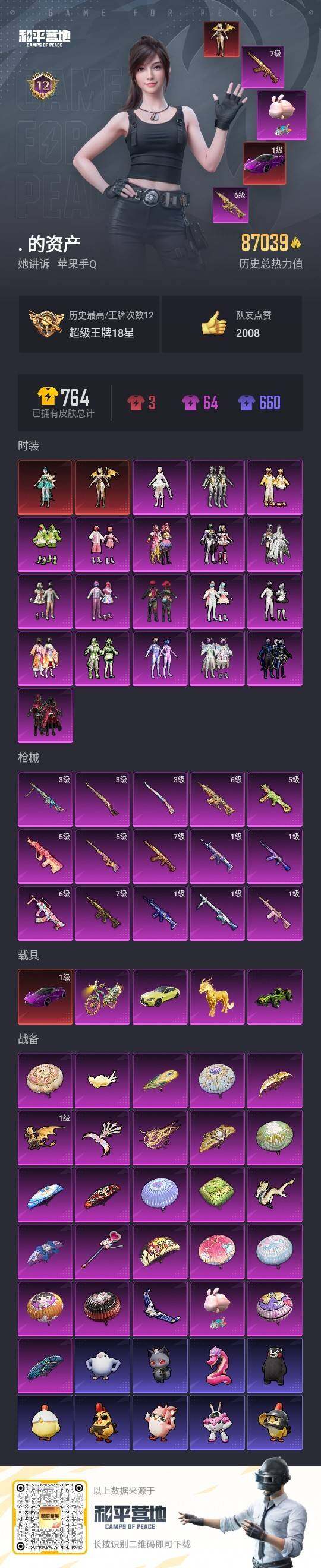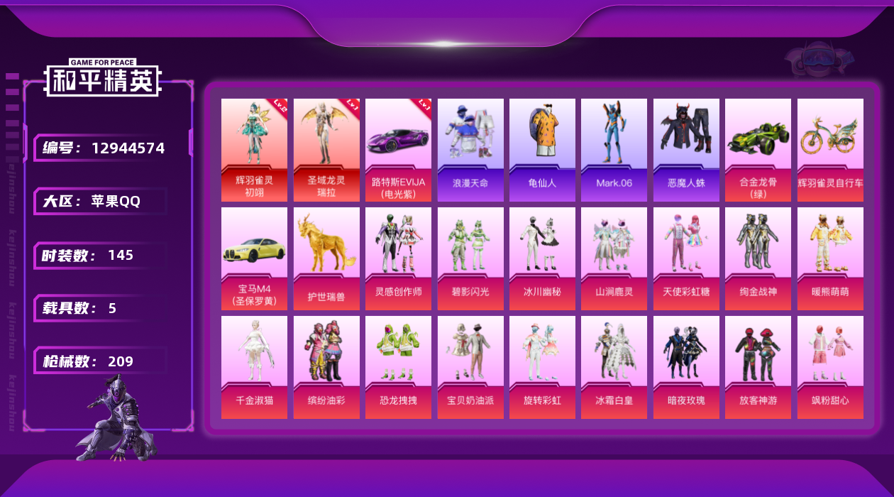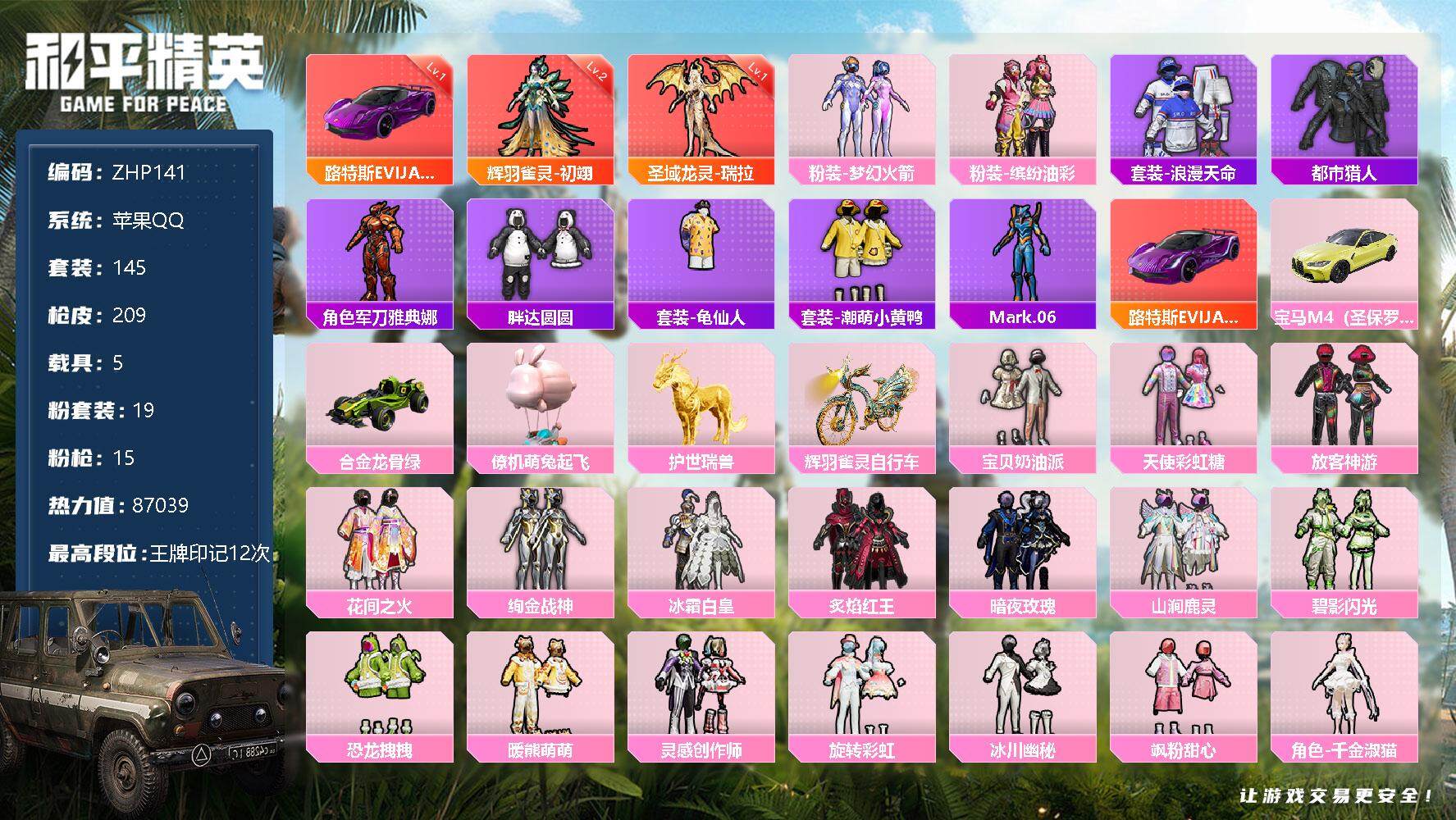 [12944574]特价急出!1级瑞拉2级初翊!1红车路特斯EVIJA!苹果 手Q-2神装-19粉装-15特效枪-5载具-7粉色飞行器-87039热力值-12王牌印记-145套装-209枪皮