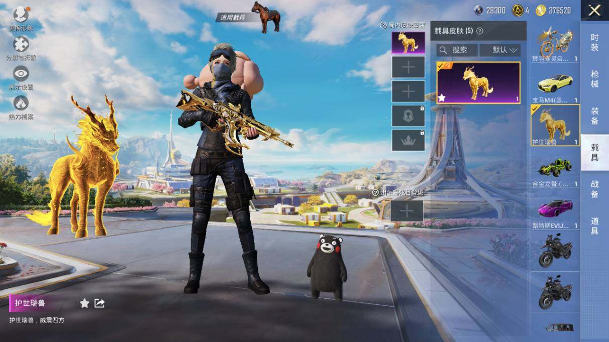 【粉色载具】:路特斯EVIJA(电光紫),宝马M4(圣保罗黄),合金龙骨(绿),僚机-萌兔起飞,护世瑞兽,辉羽雀灵自行车