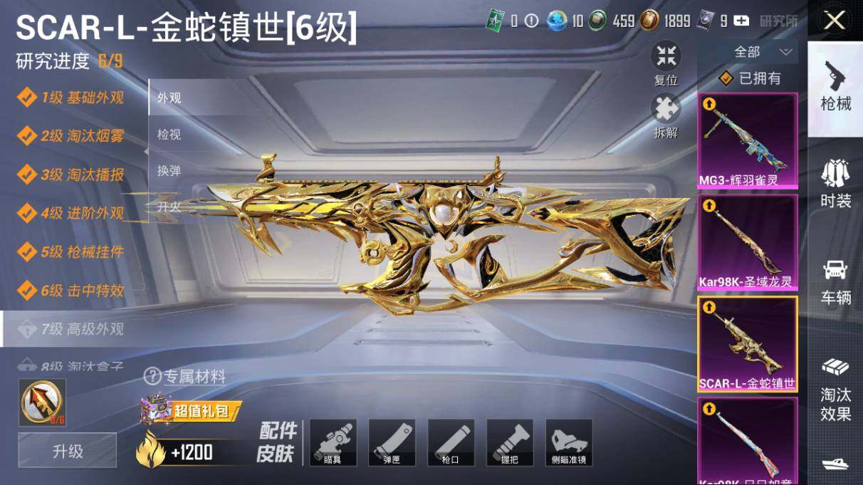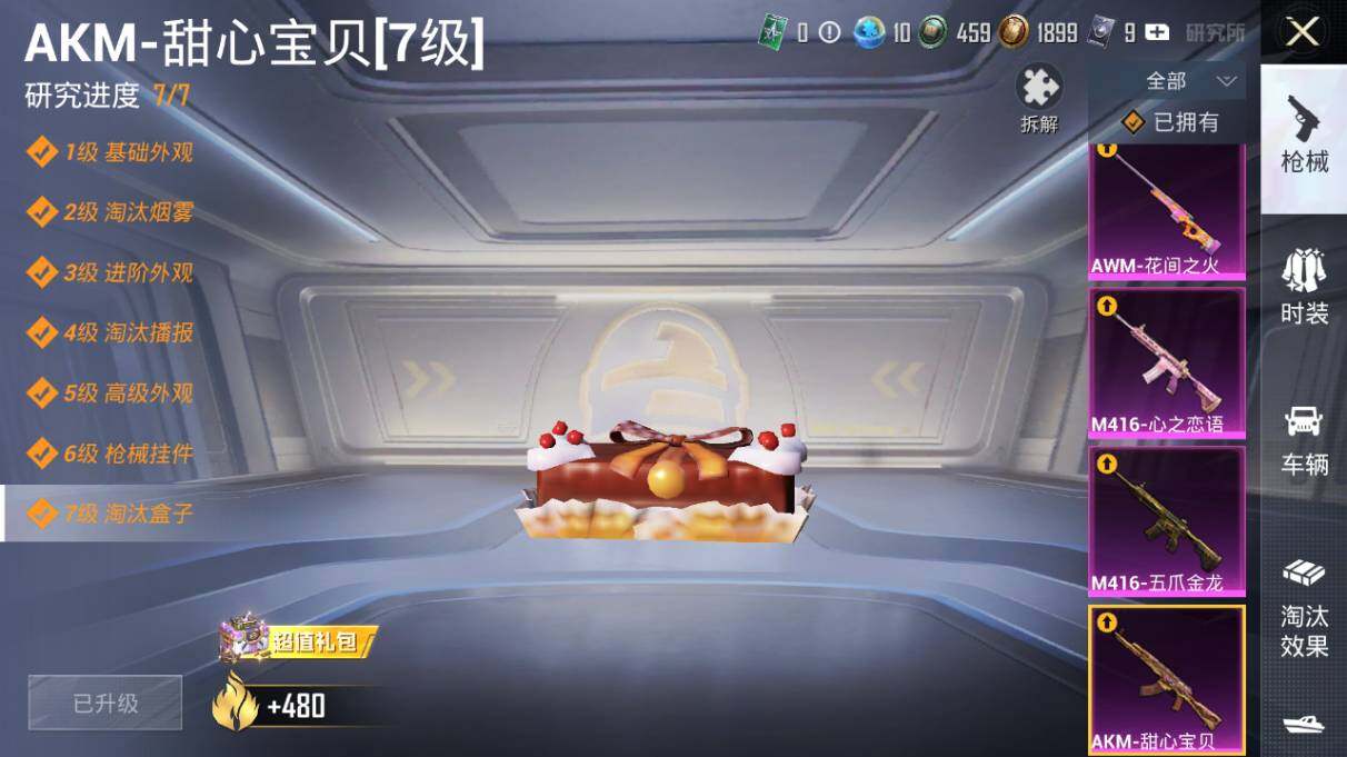 【粉色枪皮等级】:AKM-甜心宝贝(七级),AKM-星际浪客(一级),SCAR-L-童趣迷兔(一级),SCAR-L-青春物语(一级),SCAR-L-金蛇镇世(六级),M416-五爪金龙(七级),M416-心之恋语(一级),GROZA-旋转彩虹(六级),AUG-妙趣可丽(五级),UMP45-恐龙拽拽(五级),Kar98K-巳巳如意(三级),Kar98K-圣域龙灵(三级),AWM-花间之火(五级),MG3-洛神天依(一级),MG3-辉羽雀灵(三级)