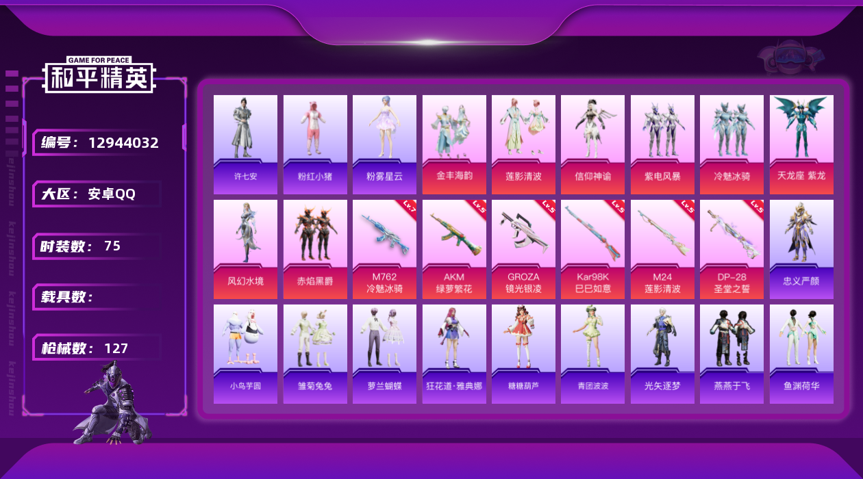 [12944032]【暑期末清货/特价急出/永久包赔】:安卓 手Q-10粉装-7特效枪-0载具-4.2w热力值-4印记-75套装-127枪皮【热门品类】:角色-忠义严颜,大砍刀-青龙偃月刀,撬棍-龙胆亮银枪【特效枪等级】:AKM-绿萝繁花(五级),GROZA-镜光银凌(五级),M762-冷魅冰骑(七级),Kar98K-巳巳如意(五级),M24-莲影清波(五级),DP-28-圣堂之誓(五级),MG3-辉羽雀灵(五级Mk14-甜梦熊击)【优质套装】:粉装-冷魅冰骑,粉装-赤焰黑爵,粉装-紫电风暴,粉装-莲影清波,角色-风幻水境,粉装-金丰海韵,角色-信仰神谕,角色-天龙座 紫龙【优质飞行器】:冷魅冰骑飞行器,镜光幻境飞行翼,祥瑞锦鲤飞行器,幽焰列车飞行器,幻星舰长飞行器