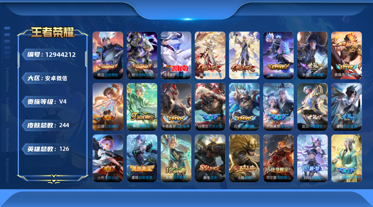 [12944212]安卓WX-V4-永恒钻石IV段位-124英雄-242皮肤-2典藏-0珍品无双-0无双-1珍品传说-15传说-72史诗 【荣耀典藏】:铠银白咏叹调,韩信弑枪猎影 【珍品传说】:马可波罗怪盗基德 【传说皮肤】:司空震愿照山河定,澜愿照九州拓,云缨幻光神枪,裴擒虎祥瑞亨通,桑启鸣野蒿,澜逐花归海,干将莫邪画中仙,孙悟空齐天大圣,吕布怒海麟威,赵云淬星耀世,小乔音你心动,虞姬启明星使,李信一念神魔,干将莫邪久胜战神,虞姬云霓雀翎 【限定皮肤】:大乔绒语心约,姜子牙天穹之誓,狄仁杰阴阳师,赵云皇家上将,嬴政白昼王子,高渐离玩趣恶龙,钟无艳超时空战士,扁鹊奇幻香踪,元歌无心,甄姬落雪兰心,典韦岱宗,狄仁杰魔术师,项羽海滩派对,王昭君午后时光,孙悟空齐天大圣,李元芳云中旅人,虞姬启明星使,钟馗神迹守卫,杨戬潮玩骑兵,干将莫邪画中仙,蔡文姬繁星吟游,鬼谷子五谷丰年,百里玄策原初追逐者,梦奇顽趣,沈梦溪大漠名商,裴擒虎李小龙,裴擒虎擒涛扼浪,狂铁电玩高手,云中君纤云弄巧,嫦娥暖冬兔眠,西施玲珑珍味,鲁班大师探海日志,桑启海盐诗旅,暃星界游侠,戈娅驭风魔法,艾琳流音漫舞,司空震地狱燃心,阿古朵江河有灵,张良古海寻踪,蒙犽百解令,蒙恬荣光圣徽,高渐离燃音魔法,妲己灵卜魔法,鬼谷子天穹祈灯,伽罗琥珀纪元,沈梦溪龙舞盛年,鲁班七号蔬乡物语,李元芳蔬乡物语,刘邦剑破天穹,程咬金群星魔术团,关羽决胜骁骑,镜青焰无极,项羽苍威无极,刘备异域游侠 【年限皮肤】:典韦岱宗,马超神威 【赛季限定】:张良古海寻踪,李元芳云中旅人,百里玄策原初追逐者,梦奇顽趣,沈梦溪大漠名商,裴擒虎擒涛扼浪,鲁班大师探海日志,桑启海盐诗旅,鬼谷子天穹祈灯,蒙恬荣光圣徽,刘邦剑破天穹,姜子牙天穹之誓 【战令限定】:嬴政白昼王子,钟无艳超时空战士,扁鹊奇幻香踪,甄姬落雪兰心,王昭君午后时光,艾琳流音漫舞,钟馗神迹守卫,杨戬潮玩骑兵,狂铁电玩高手,嫦娥暖冬兔眠,西施玲珑珍味,司空震地狱燃心,暃星界游侠,戈娅驭风魔法,高渐离燃音魔法,妲己灵卜魔法,鲁班七号蔬乡物语,李元芳蔬乡物语,镜青焰无极,项羽苍威无极 【史诗皮肤】:鲁班七号电玩小子,项羽苍穹之光,赵云皇家上将,赵云未来纪元,貂蝉圣诞恋歌,甄姬冰雪圆舞曲,王昭君偶像歌手,狄仁杰魔术师,廉颇地狱岩魂,宫本武藏鬼剑武藏,孙尚香水果甜心,嬴政暗夜贵公子,妲己魅力维加斯,墨子金属风暴