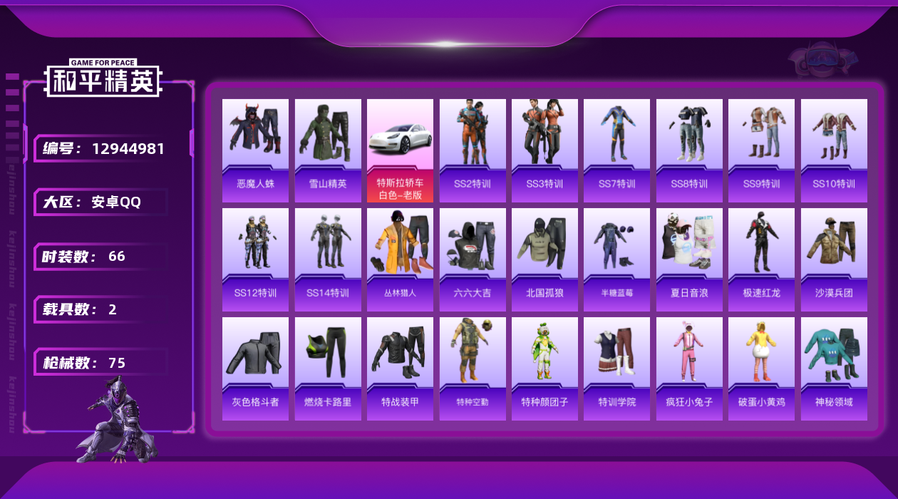 [12944981]【暑期末清货/特价急出/永久包赔】:安卓 手Q-2载具-24197热力值-2印记-66套装-75枪皮【稀有载具】:特斯拉Model 3(珍珠白)UAZ越野车-南瓜骑士
