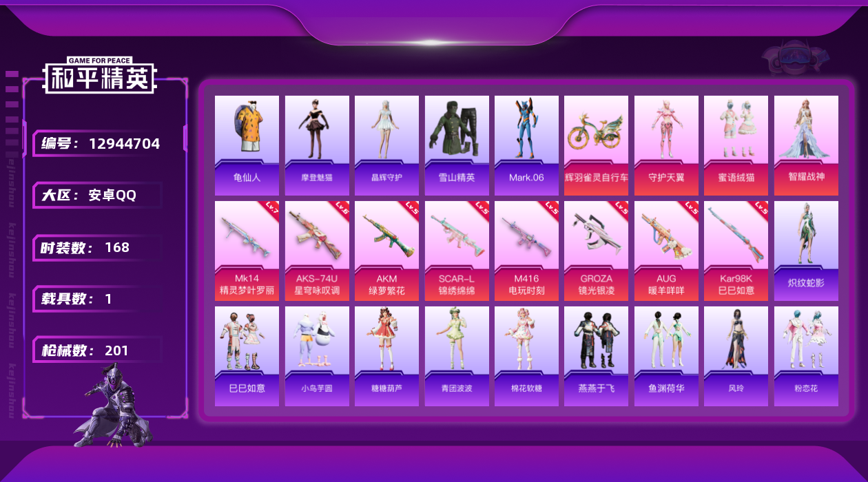 - [12456696]【商品标题】:安卓 手Q-6粉装-8特效枪-0载具-0粉色飞行器-74883热力值-11王牌印记-208套装-249枪皮 【热门品类】:套装-寒蝎幽灵,套装-浪漫天命,套装-都市猎人,套装-SS1特训,套装-龟仙人,套装-暗影哥特,套装-粉红小猪 【粉色套装】:粉装-未来战士,粉装-金属狂野,粉装-智能音符,粉装-橘柚倾心,角色-月影灵韵,角色-冰魄 【粉色枪皮等级】:AKM-梦之光华(七级),M416-电玩时刻(五级),AUG-暖羊咩咩(五级),P90-冷漠罗丽(六级),Kar98K-巳巳如意(五级),AMR-智耀战神(五级),DP-28-豹影疾电(五级),MG-36-沧焰双生(五级) 【粉色枪皮】:AKM-梦之光华,M416-电玩时刻,AUG-暖羊咩咩,P90-冷漠罗丽,Kar98K-巳巳如意,AMR-智耀战神,DP-28-豹影疾电,MG-36-沧焰双生 【粉色降落伞】:极限特训降落伞,精灵迷巫降落伞,阿狸红降落伞,流星咚咚降落伞,筑梦精灵降落伞,未来领航者降落伞,月影灵韵降落伞,冷漠罗丽降落伞,异瞳寒姬降落伞 【稀有套装】:套装-龟仙人,套装-巳巳如意,套装-糖糖葫芦,套装-青团波波,角色-摩登魅猫,角色-光矢逐梦,套装-燕燕于飞,套装-鱼渊荷华,套装-粉恋花,套装-紫幽梦,套装-蓝冰羽,套装-星渊小夜曲,套装-彩虹兔,套装-云朵鹅,套装-雪绒豹,套装-朱霞炽焰,套装-凌霄紫焰,套装-擎苍青焰,玩偶服-懒羊羊 【稀有枪皮】:AKM-夜灯,AKM-彩虹符号,AKM-灼热熔岩,AKM-破晓战魂,AKM-萌趣颜团子,AKM-霓虹街区,AKM-龙的传人,M16A4-幻世战舞者,M16A4-生命誓言,M16A4-红色方程式,M16A4-蓝色火焰,M16A4-千金淑猫,SCAR-L-夜灯,SCAR-L-炫彩节奏,SCAR-L-玉兔迎春,SCAR-L-甜蜜誓约,SCAR-L-红色方程式,M416-夜灯,M416-糯团青竹,M416-红色方程式,M416-绯红前夜,M416-蓝色火焰,GROZA-异彩先驱,GROZA-田园牧歌,GROZA-黑色刀锋,AUG-甜蜜菠萝,AUG-耀粉歌者,QBZ-原初圣火,QBZ-彩虹符号,QBZ-飞驰魅影,M762-天降萌叽,M762-快乐主宰,M762-拳皇97,M762-深海曼妙,M762-牛气冲天,M762-绯红前夜,M762-镭射皇者