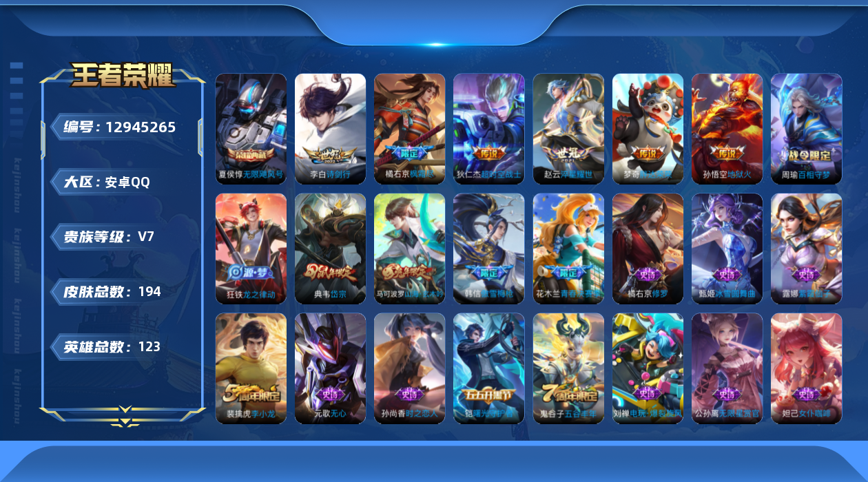 [12945265]【特价急出/详情看图】:安卓Q-V7-永恒钻石I段位-123英雄-194皮肤-1典藏-6传说-47史诗