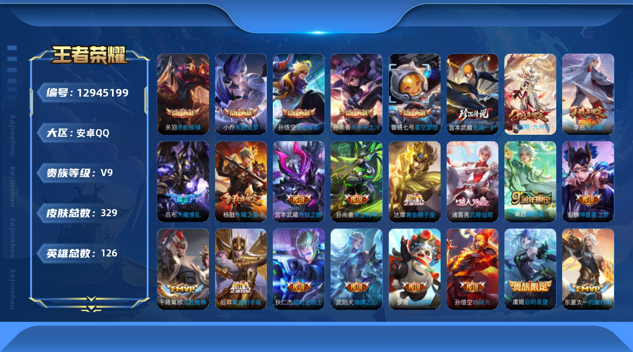 [12945199]【特价急出/详情看图】:安卓Q-V9-至尊星耀I段位-126英雄-329皮肤-5典藏-1珍品传说-18传说-80史诗