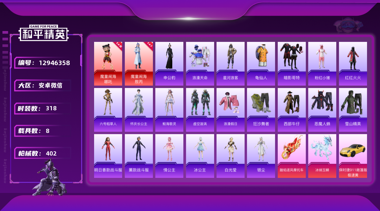 [12946358]六级哪吒!安卓 微信-2神装-36粉装-22特效枪-8载具-17粉色飞行器-176198热力值-17王牌印记-318套装-402枪皮