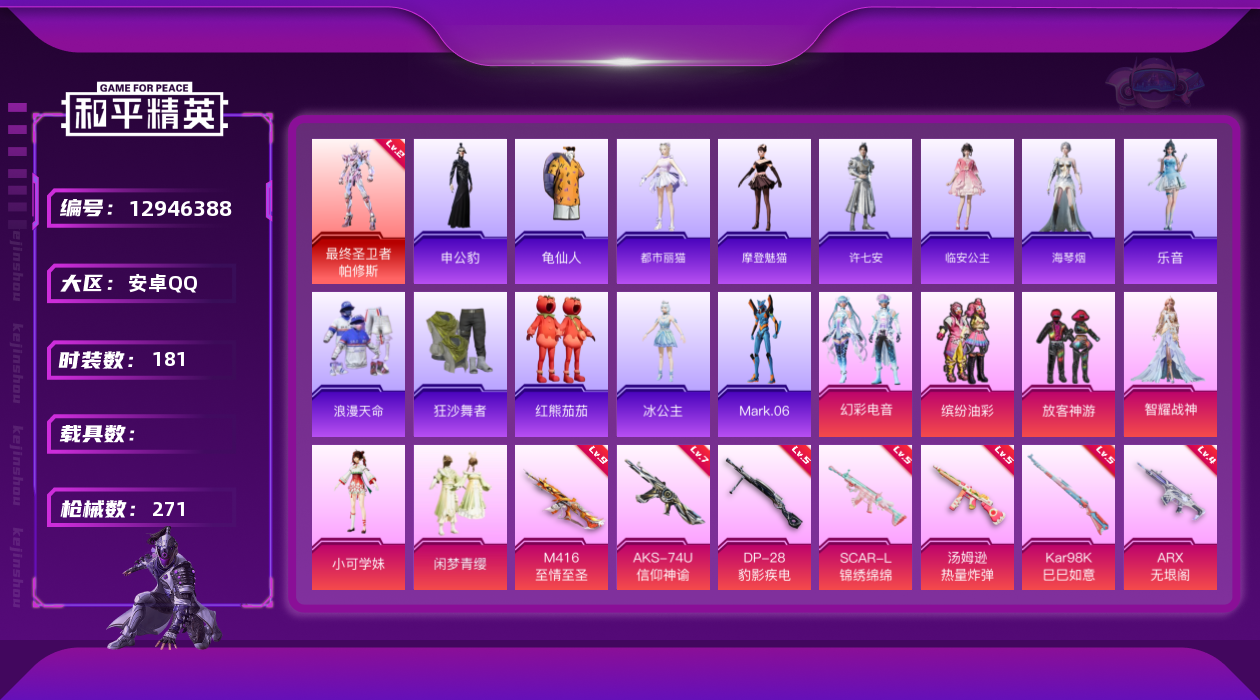 [12946388]绝世印记2/地铁满天赋/M416-至情至圣(九级)【暑期末清货/特价急出/永久包赔/商品详情看图】:安卓 手Q-1红装-7粉装-9特效枪-8.4w热力值-19印记-181套装-271枪皮【热门品类】:套装-小丑鱼,套装-金羽特工【角色神装等级】:最终圣卫者-帕修斯(二级)【特效枪等级】:SCAR-L-锦绣绵绵(五级),M416-至情至圣(九级),ARX-无垠阁(四级),汤姆逊-热量炸弹(五级),AKS-74U-信仰神谕(七级),Kar98K-巳巳如意(五级),Kar98K-圣域龙灵(三级),M417-第五大道(一级),DP-28-豹影疾电(五级)【优质套装】:粉装-梦幻火箭,粉装-缤纷油彩,粉装-放客神游,角色-小可学妹,粉装-闲梦青缨,角色-智耀战神,粉装-幻彩电音【优质飞行器】:镜域双华-灵镜之阶,脆鲨七海飞行器,圣域金龙飞行器,终晖之翼飞行器