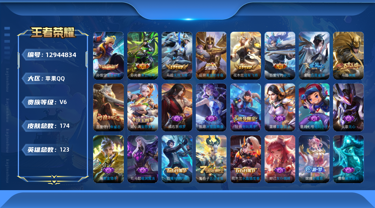 [12944834]【特价急出/详情看图】:苹果Q-V6-至尊星耀II段位-123英雄-174皮肤-1典藏-6传说-57史诗
