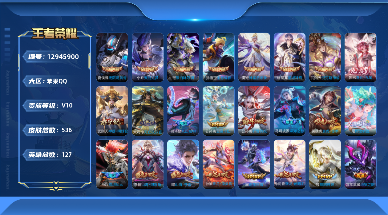 [12945900]发育路30段【特价急出/详情看图】:苹果Q-V10-至尊星耀II段位-127英雄-536皮肤-7典藏-2无双-72传说-180史诗
