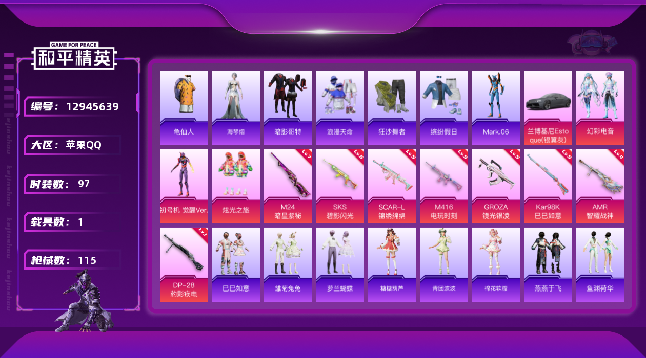 [12945639]【暑期末清货/特价急出/永久包赔】:苹果 手Q-4粉装-8特效枪-1载具-3.9w热力值-4印记-97套装-115枪皮【稀有载具】:兰博基尼Estoque(银翼灰)【特效枪等级】:SCAR-L-锦绣绵绵(五级),M416-电玩时刻(五级),GROZA-镜光银凌(五级),Kar98K-巳巳如意(五级),M24-暗星紫秘(七级),SKS-碧影闪光(六级),AMR-智耀战神(四级),DP-28-豹影疾电(一级)【优质套装】:粉装-梦幻火箭,粉装-炫光之旅,角色-初号机 觉醒Ver.,粉装-幻彩电音