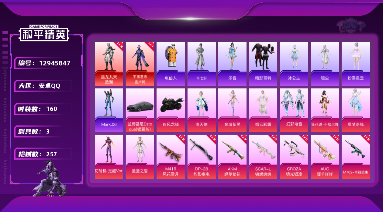 [12945847]【暑期末清货/特价急出/永久包赔】:安卓 手Q-2红装-9粉装-16特效枪-2载具-9.2w热力值-16印记-160套装-257枪皮【热门品类】:角色-军刀雅典娜【角色神装等级】:宇宙意志-塞卢姆(一级),墨龙九天-敖渊(三级)【稀有载具】:兰博基尼Estoque(银翼灰),疾风龙骑,僚机-圣域龙宝【特效枪等级】:AKM-绿萝繁花(五级),SCAR-L-锦绣绵绵(五级),M416-风花雪月(六级),M416-墨龙九天(三级),GROZA-镜光银凌(五级),AUG-暖羊咩咩(五级),M762-青锋波束(五级),UMP45-量子极限(五级),UMP45-宇宙意志(三级),Vector-最终圣卫者(三级),Kar98K-巳巳如意(五级),M24-镜域双华(三级),M200-梦海之灵(三级),DP-28-豹影疾电(五级),MG3-洛神天依(五级),PKM-江南烟雨(五级)【优质套装】:粉装-梦幻火箭,角色-洛天依,角色-圣堂之誓,角色-烟云彩露,角色-星梦奇缘,角色-初号机 觉醒Ver.,角色-金域紫灵,角色-狂花道·不知火舞,粉装-幻彩电音【优质飞行器】:天之羽翼飞行器,星夜魔法师飞行翼,歌者泠鸢飞行器,镜光幻境飞行翼,镜域双华-灵镜之阶,绝色倾城飞行器,龙翔九天飞行器,幻海精灵飞行器,深渊漩涡飞行器,凤舞九天飞行器,圣域金龙飞行器