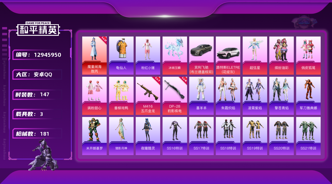 [12945950]【暑期末清货/特价急出/永久包赔】:安卓 手Q-1红装-5粉装-2特效枪-3载具-6.4w热力值-12印记-147套装-181枪皮【热门品类】:套装-奇异狩猎者,角色-军刀雅典娜【角色神装等级】:魔童闹海-敖丙(二级)【稀有载具】:路特斯ELETRE(花绽灰),宾利飞驰(布罗德盖棕双色),冰绡玉鳞【特效枪等级】:M416-五爪金龙(七级),DP-28-豹影疾电(四级)【优质套装】:粉装-缤纷油彩,粉装-俏皮狐尾,粉装-垂柳戏鸭,粉装-飒粉甜心,角色-超弦星【优质飞行器】:灵珠游龙飞行器
