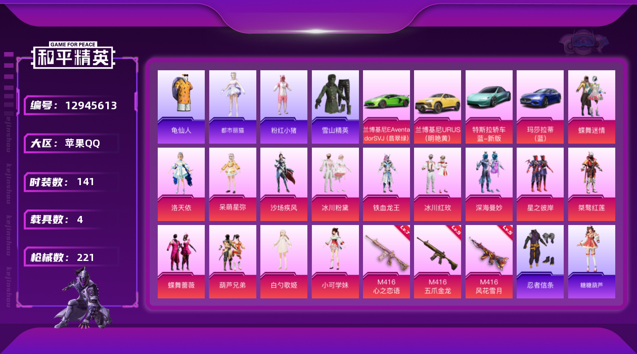 [12945613]【暑期末清货/特价急出/永久包赔】:苹果 手Q-15粉装-3特效枪-4载具-7.6w热力值-7印记-141套装-221枪皮【热门品类】:套装-沙漠守护者,套装-忍者信条【稀有载具】:特斯拉Roadster(水滴蓝),兰博基尼Aventador SVJ(翡翠绿),兰博基尼URUS(明艳黄),玛莎拉蒂Ghibli(蓝)【特效枪等级】:M416-五爪金龙(五级),M416-心之恋语(七级),M416-风花雪月(五级)【优质套装】:粉装-深海曼妙,粉装-蝶舞迷情,粉装-梦幻火箭,粉装-星之彼岸,粉装-蝶舞蔷薇,粉装-葫芦兄弟,粉装-铁血龙王,粉装-桀骜红莲,角色-洛天依,粉装-沙场疾风,粉装-冰川粉黛,粉装-冰川红玫,角色-白勺歌姬,角色-呆萌星弥,角色-小可学妹【优质飞行器】:梦幻火箭飞行器
