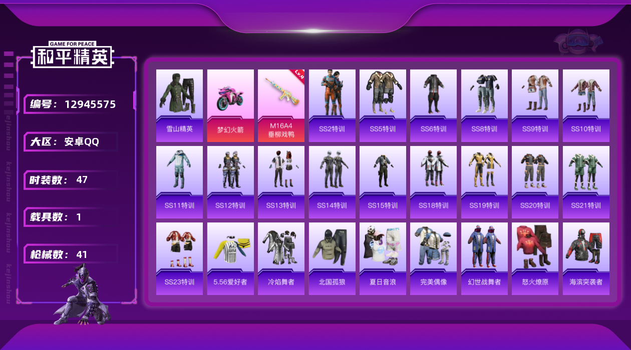 [12945575]【暑期末清货/特价急出/永久包赔】:安卓 手Q-0粉装-1特效枪-1载具-1.4w热力值-3印记-47套装-41枪皮【热门品类】:套装-SS1特训【稀有载具】:双人摩托-梦幻火箭【特效枪等级】:M16A4-垂柳戏鸭(四级)