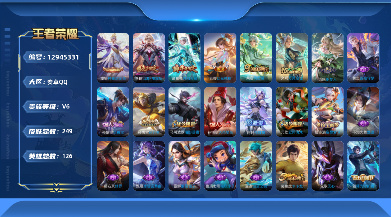 [12945331]安卓Q-V6-至尊星耀III段位-124英雄-246皮肤-1典藏-0珍品无双-0无双-0珍品传说-4传说-65史诗 【荣耀典藏】:虞姬神鉴启示录 【传说皮肤】:云缨幻光神枪,桑启鸣野蒿,李信山海炽霜斩,诸葛亮时雨天司 【限定皮肤】:姜子牙天穹之誓,狄仁杰阴阳师,赵云皇家上将,墨子神迹守卫,庄周高山流水,高渐离死亡摇滚,高渐离玩趣恶龙,阿轲迷踪丽影,钟无艳超时空战士,元歌云间偶戏,元歌无心,甄姬落雪兰心,马可波罗暗影游猎,狄仁杰魔术师,狄仁杰万华元夜,达摩星际陆战队,达摩沙漠行僧,项羽海滩派对,老夫子醍醐杖,老夫子航海奇遇记,程咬金演武夺筹,刘邦夺宝奇兵,韩信逐梦之影,兰陵王金庭之子,亚瑟潮玩骑士王,孙悟空至尊宝,孙悟空大圣娶亲,孙悟空孙行者,李元芳云中旅人,钟馗驱傩正仪,干将莫邪胡桃夹子,雅典娜单词大作战,雅典娜黎明之约,鬼谷子原初探秘者,鬼谷子五谷丰年,诸葛亮时雨天司,苏烈千军破阵,百里玄策原初追逐者,弈星混沌棋,梦奇顽趣,沈梦溪大漠名商,明世隐疑决卦,裴擒虎李小龙,裴擒虎擒涛扼浪,米莱狄胡桃异想国,云中君纤云弄巧,李信山海炽霜斩,猪八戒西部大镖客,上官婉儿梁祝,嫦娥暖冬兔眠,蒙犽狂想玩偶喵,鲁班大师探海日志,桑启海盐诗旅,暃星界游侠,艾琳女武神,阿古朵江河有灵,张良古海寻踪,蒙恬荣光圣徽,鬼谷子天穹祈灯,姬小满妄想食味,沈梦溪龙舞盛年,刘邦剑破天穹 【年限皮肤】:诸葛亮时雨天司,李信山海炽霜斩 【赛季限定】:狄仁杰万华元夜,达摩沙漠行僧,老夫子醍醐杖,程咬金演武夺筹,兰陵王金庭之子,张良古海寻踪,李元芳云中旅人,钟馗驱傩正仪,雅典娜黎明之约,鬼谷子原初探秘者,苏烈千军破阵,百里玄策原初追逐者,弈星混沌棋,梦奇顽趣,沈梦溪大漠名商,明世隐疑决卦,裴擒虎擒涛扼浪,鲁班大师探海日志,桑启海盐诗旅,鬼谷子天穹祈灯,蒙恬荣光圣徽,刘邦剑破天穹,姜子牙天穹之誓 【战令限定】:墨子神迹守卫,阿轲迷踪丽影,钟无艳超时空战士,元歌云间偶戏,甄姬落雪兰心,马可波罗暗影游猎,达摩星际陆战队,老夫子航海奇遇记,刘邦夺宝奇兵,亚瑟潮玩骑士王,雅典娜单词大作战,米莱狄胡桃异想国,猪八戒西部大镖客,嫦娥暖冬兔眠,蒙犽狂想玩偶喵,暃星界游侠 【史诗皮肤】:鲁班七号电玩小子,露娜紫霞仙子,赵云皇家上将,赵云未来纪元,貂蝉圣诞恋歌,甄姬冰雪圆舞曲,王昭君偶像歌手,狄仁杰魔术师,廉颇地狱岩魂,宫本