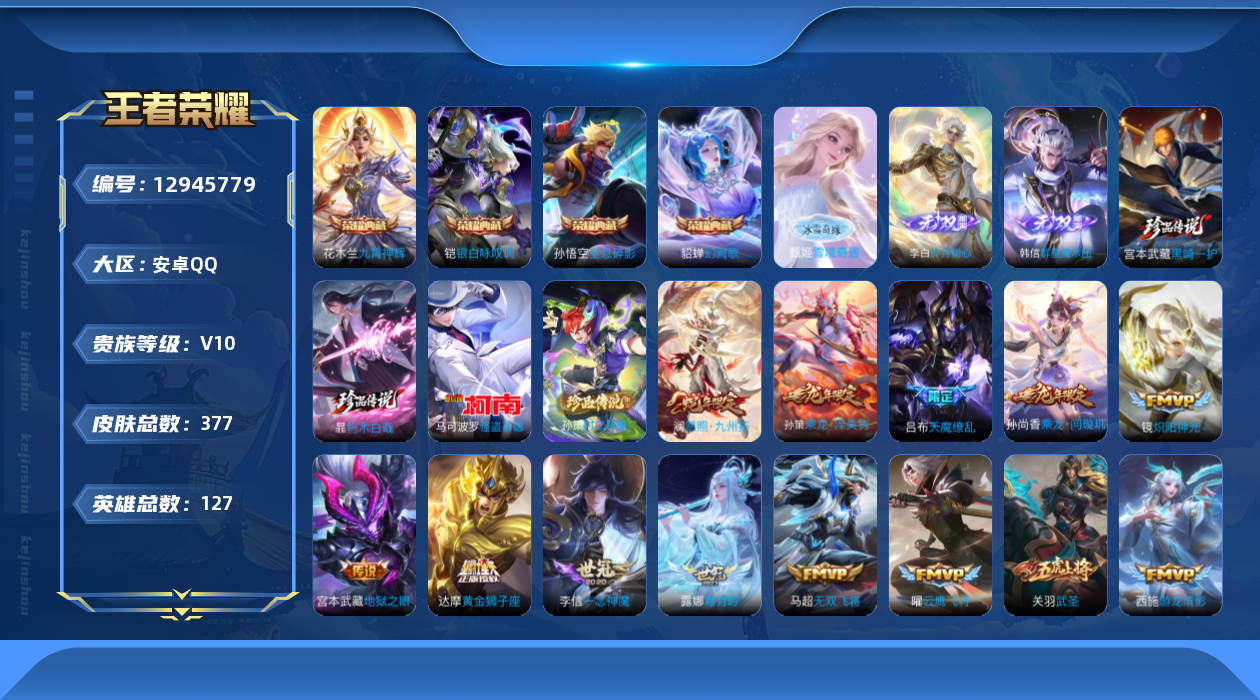 - [10562186]V10 6典藏 1无双 1珍品传说 77传说 125英雄 506皮肤 可修改实名 荣耀水晶:拾光映像(瑶典藏),神鉴启示录,弑枪猎影(韩信典藏),全息碎影(猴子典藏),杀手不太冷,天鹅之梦(小乔典藏) 无双皮:离恨烟(公孙离无双) 珍品传说:怪盗基德 传说皮:牧神诗旅,游龙清影(小青龙),山海·炽霜斩(李信年限),山海·琳琅生(小乔年限),大乔-时之奇旅,黄金狮子座,黄金射手座,黄金白羊座,零号·赤焰,地狱火,仲夏夜之梦(大飞蛾),地狱之眼,末日机甲-孙尚香(绿蚂蚱),云霓雀翎,一念神魔,淬星耀世,冠军飞将,久胜战神,猫影幻舞,云鹰飞将(小将军),炽阳神光,无双飞将,音你心动-周瑜,胖达荣荣,乞巧织情,时之恋人-刘备(电焊工),飞鸢探春,绛天战甲(鸡嘴战神),超时空战士-狄仁杰,末日机甲-孙策,花朝如约(花篮子),挚爱之约,音你闪耀(rap皮),碎云,神器·狴犴令,山海·苍雷引(电光曜子),炽翼辉光(娃娃菜牛角包),燃星之曲,画中仙,记忆之芯(机甲兔),百相守梦(张飞),追逃游戏(安琪拉),追逃游戏(亚瑟),电玩·雷克斯,鹤羽星尊,灼幽烈阳,妄想实况,惊梅引,遇见神鼓,澜逐花归海,艾琳觅芳踪 珍宝阁皮:妄想食味,优雅恋人,蔷薇恋人,女武神 限定皮:逐霄战戟,映山客,陌上桑,鸣野蒿,夏侯惇霜北刀,至尊宝,白虎志(电光耗子),凤求凰(白切鸡),凤凰于飞,太华(伽罗年限),异界灵契(白毛香),傲雪梅枪,寅虎·展翼(孙膑年限),星穹之声,绯月行,时之彼端,白鹤梁神女,白晶晶,时雨天司(水龙头),神威(电光马子),飞衡(韩信年限),玄嵩(庄周年限),山海·碧波行(瑶年限),无限倾心-项羽,影龙天霄,遇见飞天,高山流水,诗剑行,无限倾心-虞姬,齐天大圣,匿光决锋者,怒海麟威,降魔,五谷丰年,青龙志(铠年限),冰锋战神,幽恒(沐浴露),武圣,天狼运算者,游园惊梦,梁祝,御风骁将(吕布年限),天狼狩猎者,龙胆,烈魂,岱宗(典韦年限),虎魄,天狼征服者,奔雷神使(牛魔年限),祈雪灵祝(雪兔子),天狼绘梦者,李小龙,逐梦之影,逐梦之光,朱雀志(守约年限),辉光之辰,如梦令-嫦娥,如梦令-后羿,奇迹圣诞,默契交锋-兰陵王,默契交锋-花木兰,孙行者,猪悟能,一生所爱,大圣娶亲,引擎之心,天魔缭乱,青春决赛季,冰霜恋舞曲,乒乒小将,神奇女侠,美猴王,匿光追影者,女儿国国王,寅虎·御盾(廉颇年