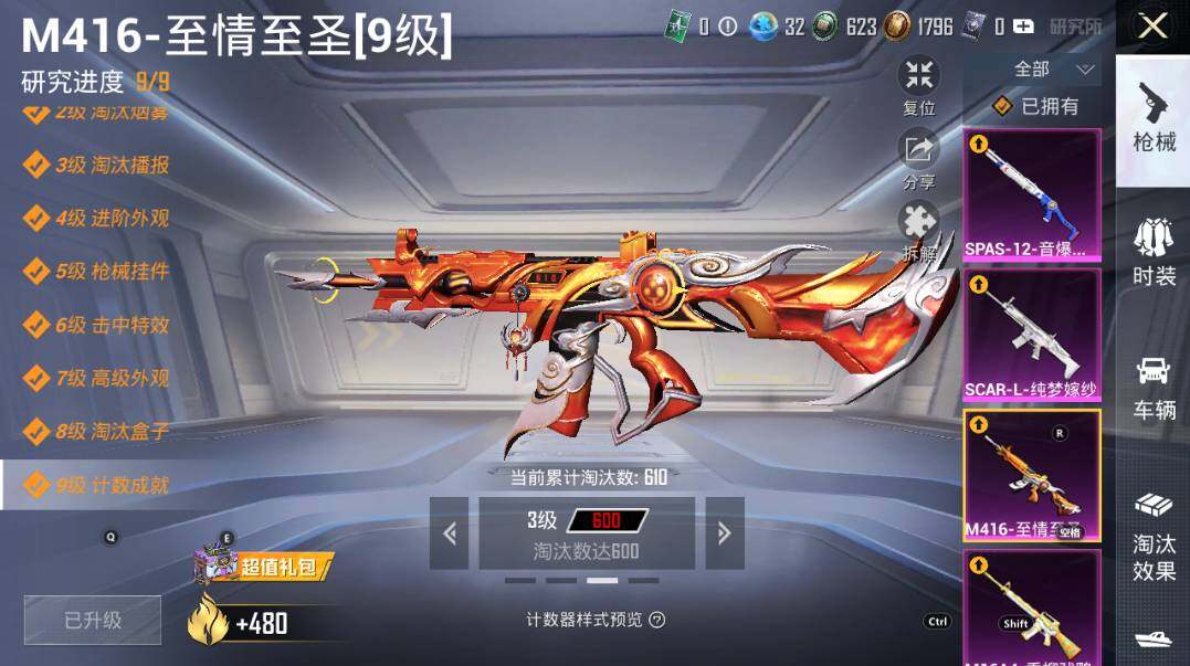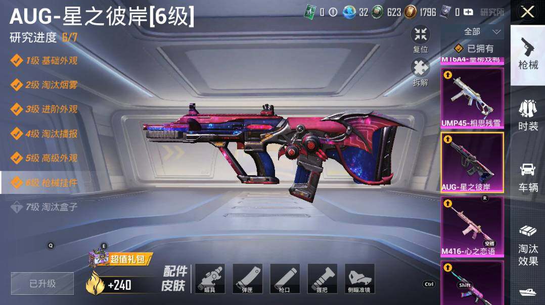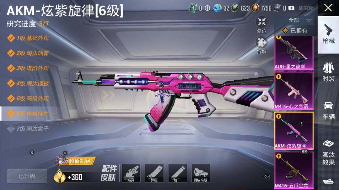 【粉色枪皮等级】:AKM-炫紫旋律(六级),M16A4-垂柳戏鸭(三级),SCAR-L-纯梦嫁纱(五级),M416-五爪金龙(二级),M416-心之恋语(二级),M416-至情至圣(九级),M416-女娲灵识(三级),GROZA-镜光银凌(五级),AUG-星之彼岸(六级),AUG-暖羊咩咩(五级),AUG-圣斗士星矢(二级),UMP45-相思残雪(七级),P90-魔童闹海 敖丙(三级),Kar98K-巳巳如意(五级),M200-伏羲圣卦(四级),SPAS-12-音爆索尼克(四级),DP-28-圣堂之誓(四级),DP-28-豹影疾电(五级),MG-36-沧焰双生(五级)
