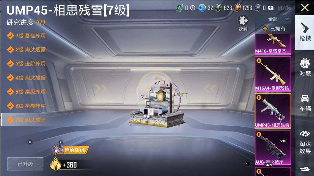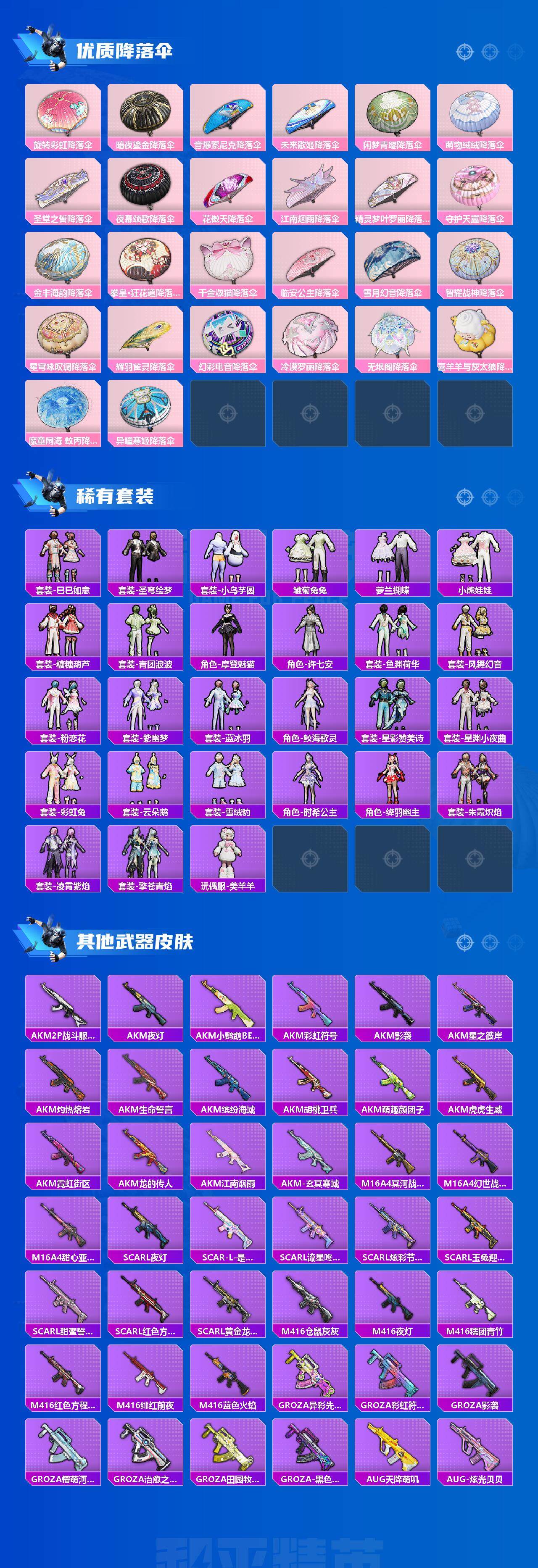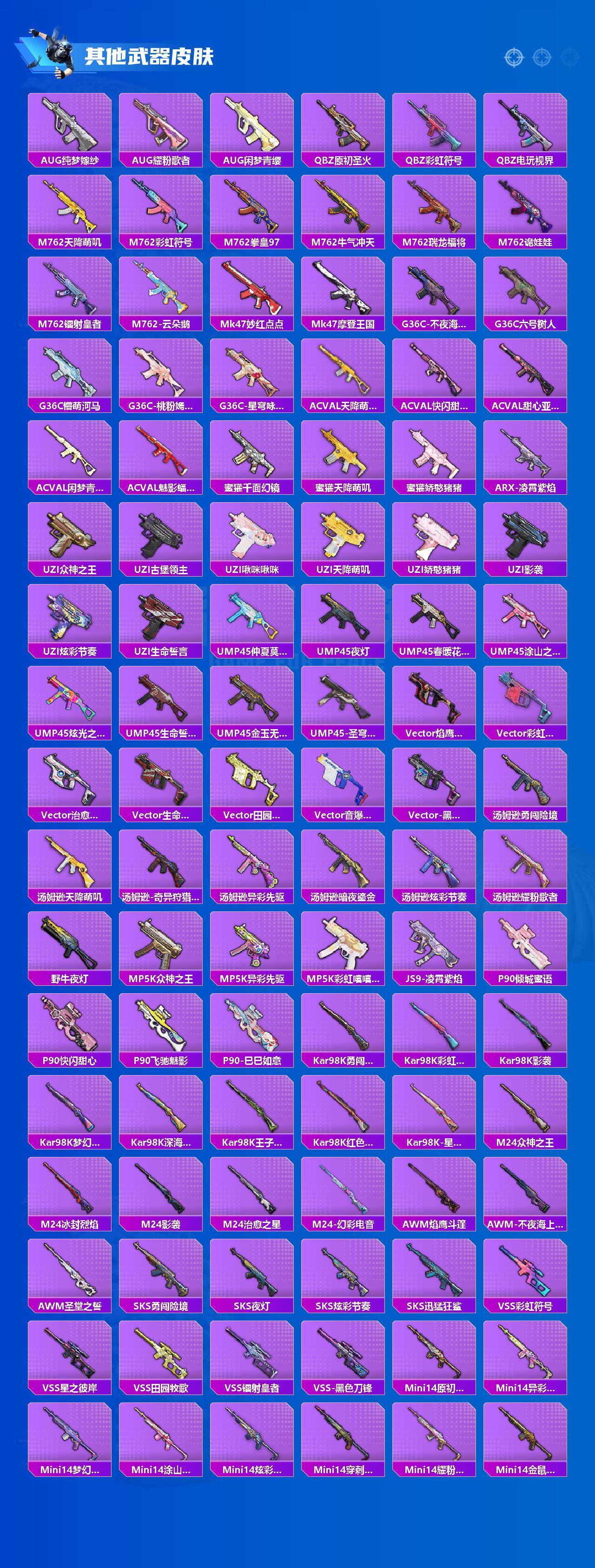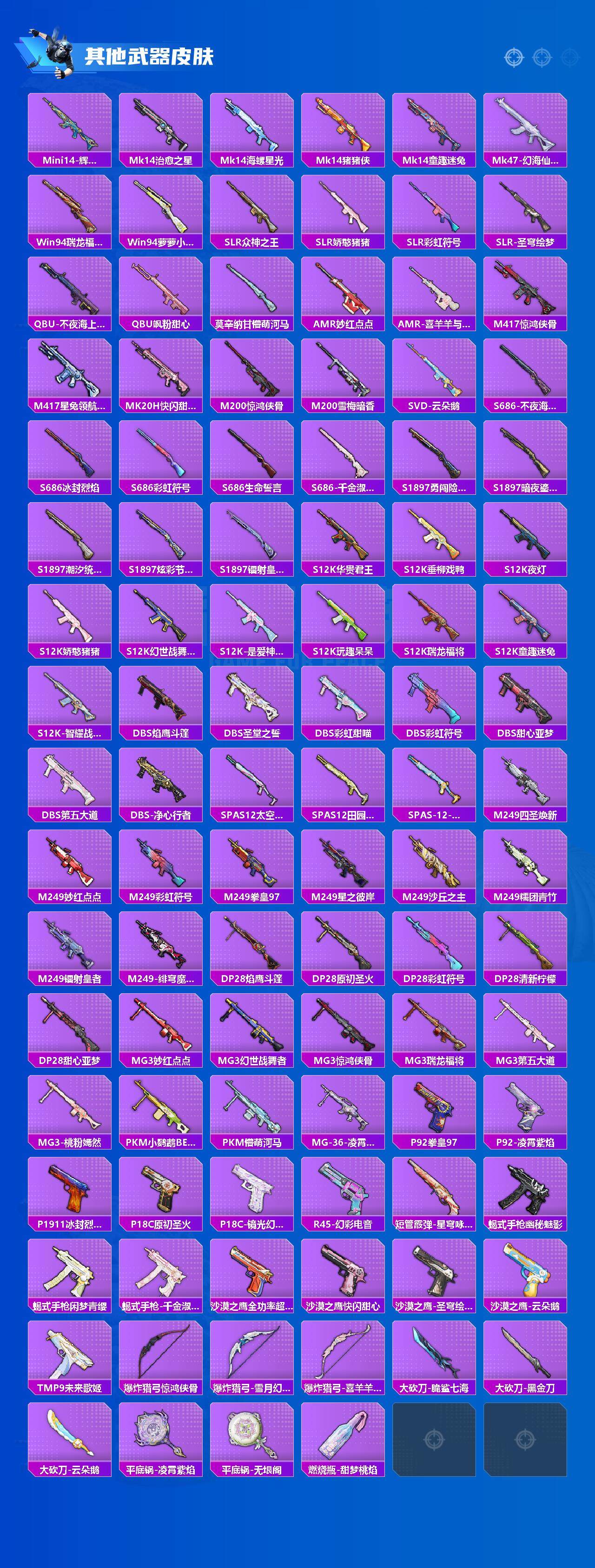 AKM-炫紫旋律,M16A4-垂柳戏鸭,SCAR-L-纯梦嫁纱,M416-五爪金龙,M416-心之恋语,M416-至情至圣,M416-女娲灵识,GROZA-镜光银凌,AUG-星之彼岸,AUG-暖羊咩咩,UMP45-相思残雪,Kar98K-巳巳如意,Mk14-闲梦青缨,M200-伏羲圣卦,SPAS-12-音爆索尼克,DP-28-圣堂之誓,破片手榴弹-粉粉猫爪