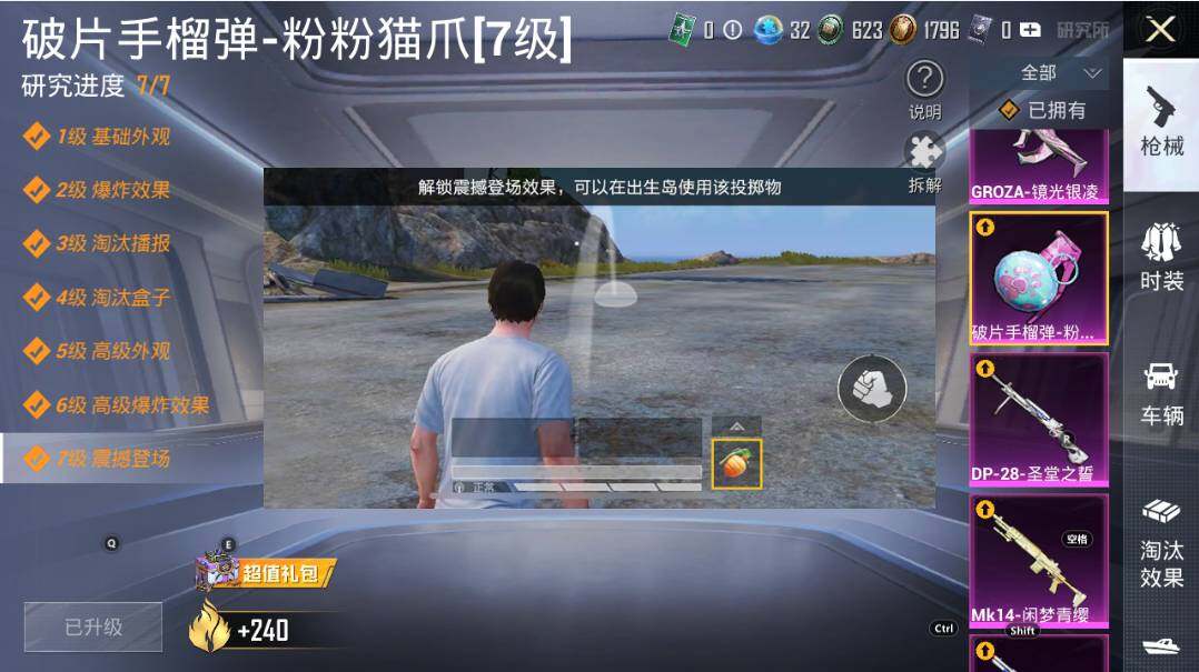 【粉色枪皮】:AKM-炫紫旋律,M16A4-垂柳戏鸭,SCAR-L-纯梦嫁纱,M416-五爪金龙,M416-心之恋语,M416-至情至圣,M416-女娲灵识,GROZA-镜光银凌,AUG-星之彼岸,AUG-暖羊咩咩,AUG-圣斗士星矢,UMP45-相思残雪,P90-魔童闹海 敖丙,Kar98K-巳巳如意,Mk14-闲梦青缨,M200-伏羲圣卦,SPAS-12-音爆索尼克,DP-28-圣堂之誓,DP-28-豹影疾电,MG-36-沧焰双生,破片手榴弹-粉粉猫爪