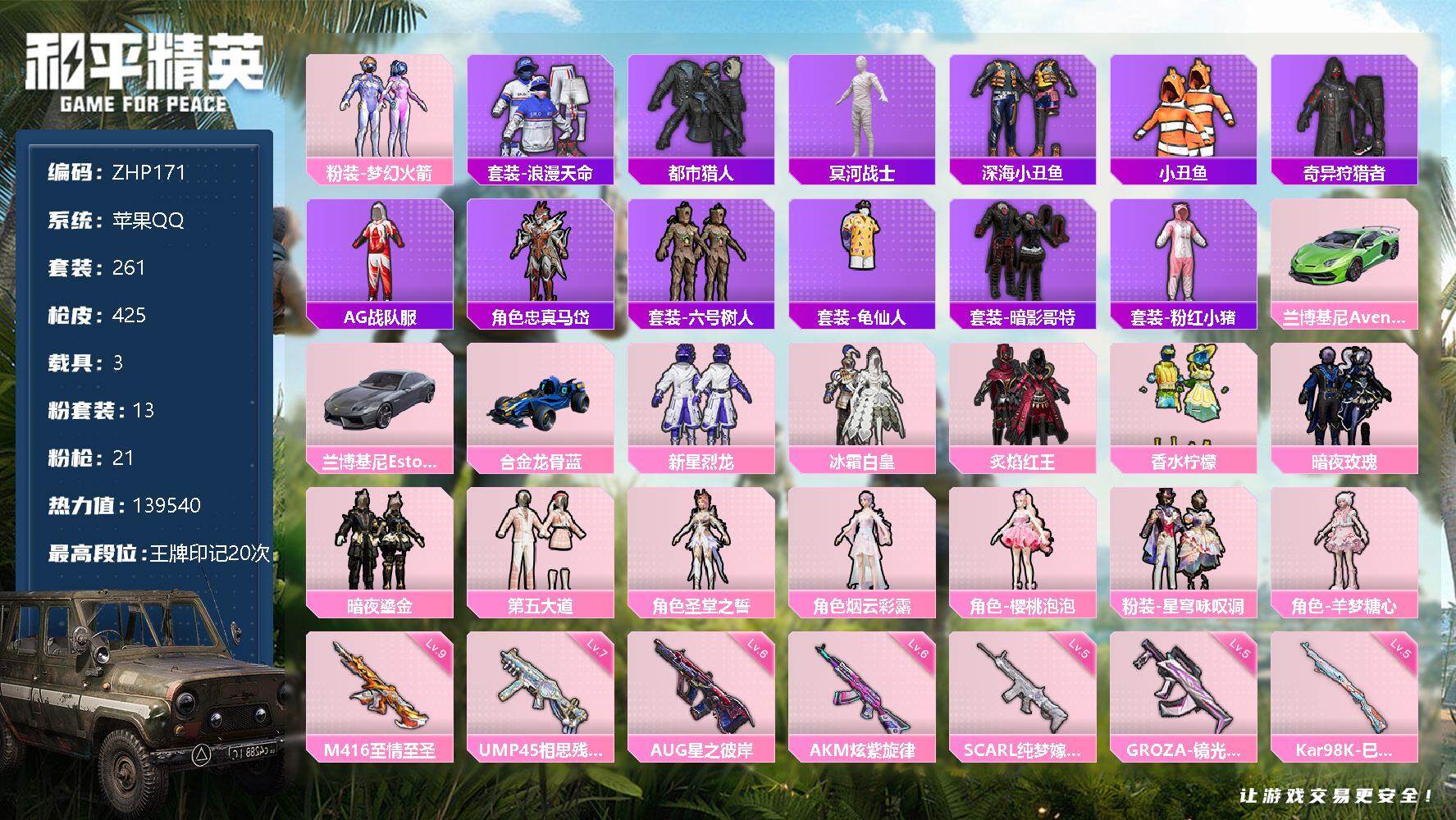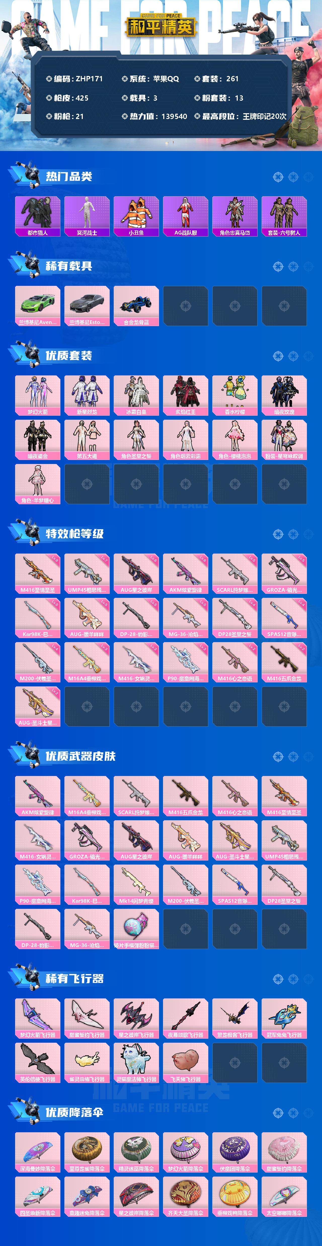 - PX_2070715- 包人脸 安卓手Q-15王牌印记-5粉装-5特效枪-0载具-76950热力值-190套装-242枪皮-0卓越印记-0传奇印记, 【5粉装】,宝贝奶油派,千金淑猫,未来领航者,天启纪元,未来歌姬, 【5特效枪】,AKM-绿萝繁花-5级,SCAR-L-锦绣绵绵-5级,M416-心之恋语-7级,Kar98K-巳巳如意-5级,SPAS-12-音爆索尼克-7级, 【3稀有紫装】,奇异狩