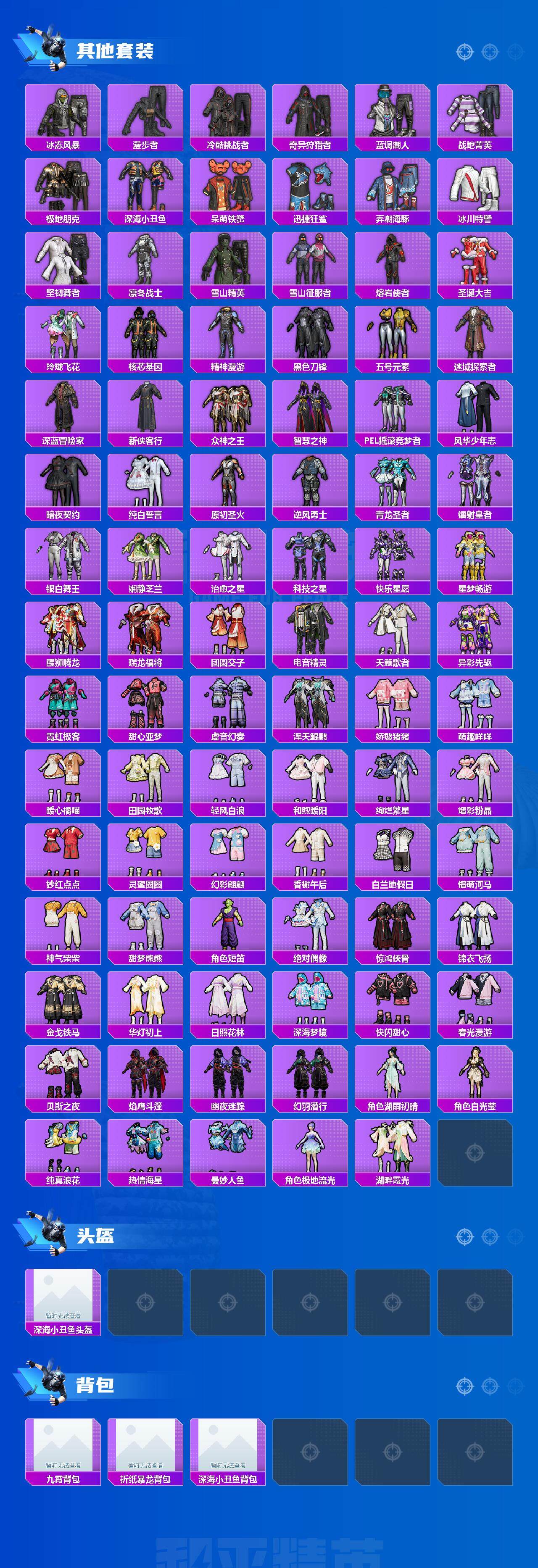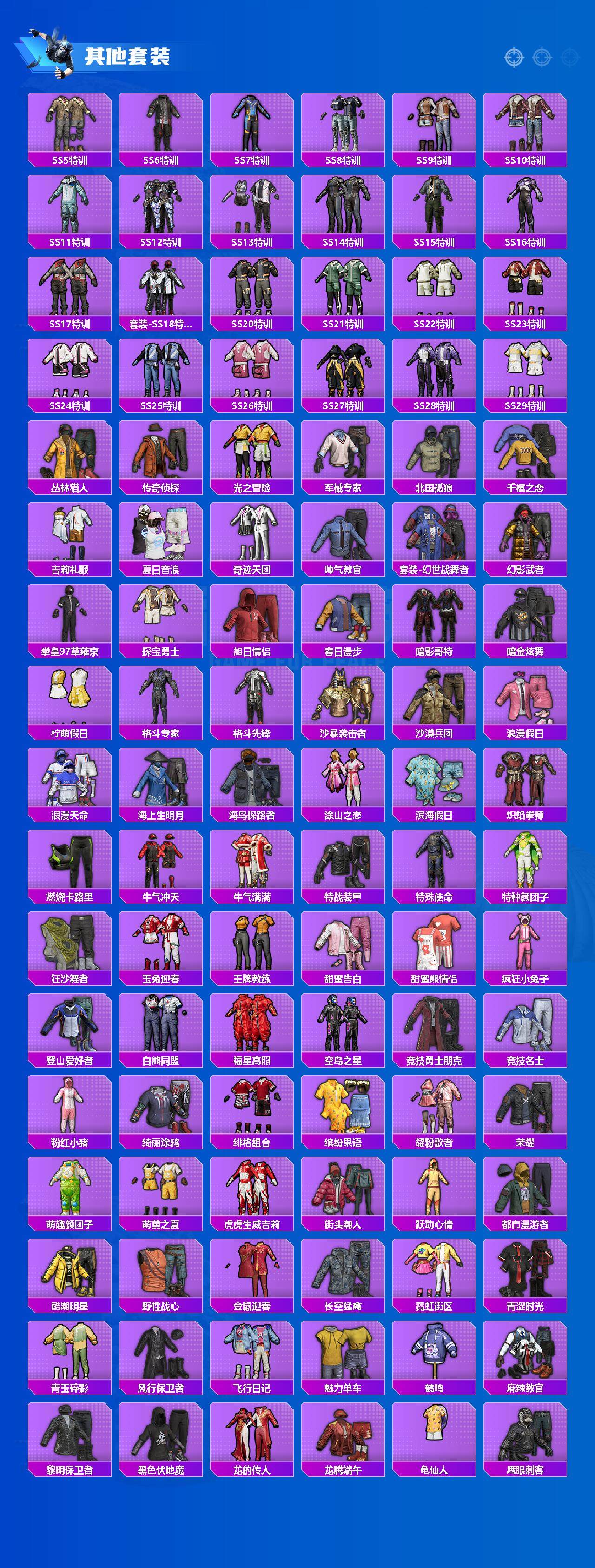 套装-浪漫天命,套装-六号树人,套装-龟仙人,套装-暗影哥特,套装-粉红小猪,套装-狂沙舞者,套装-漫步者,套装-弄潮海豚,套装-雪山精英,套装-黑色刀锋,新侠客行套装,风华少年志套装,套装-暗夜契约,套装-纯白誓言,套装-青龙圣者,套装-娴静芝兰,套装-醒狮腾龙,套装-瑞龙福将,套装-团圆交子