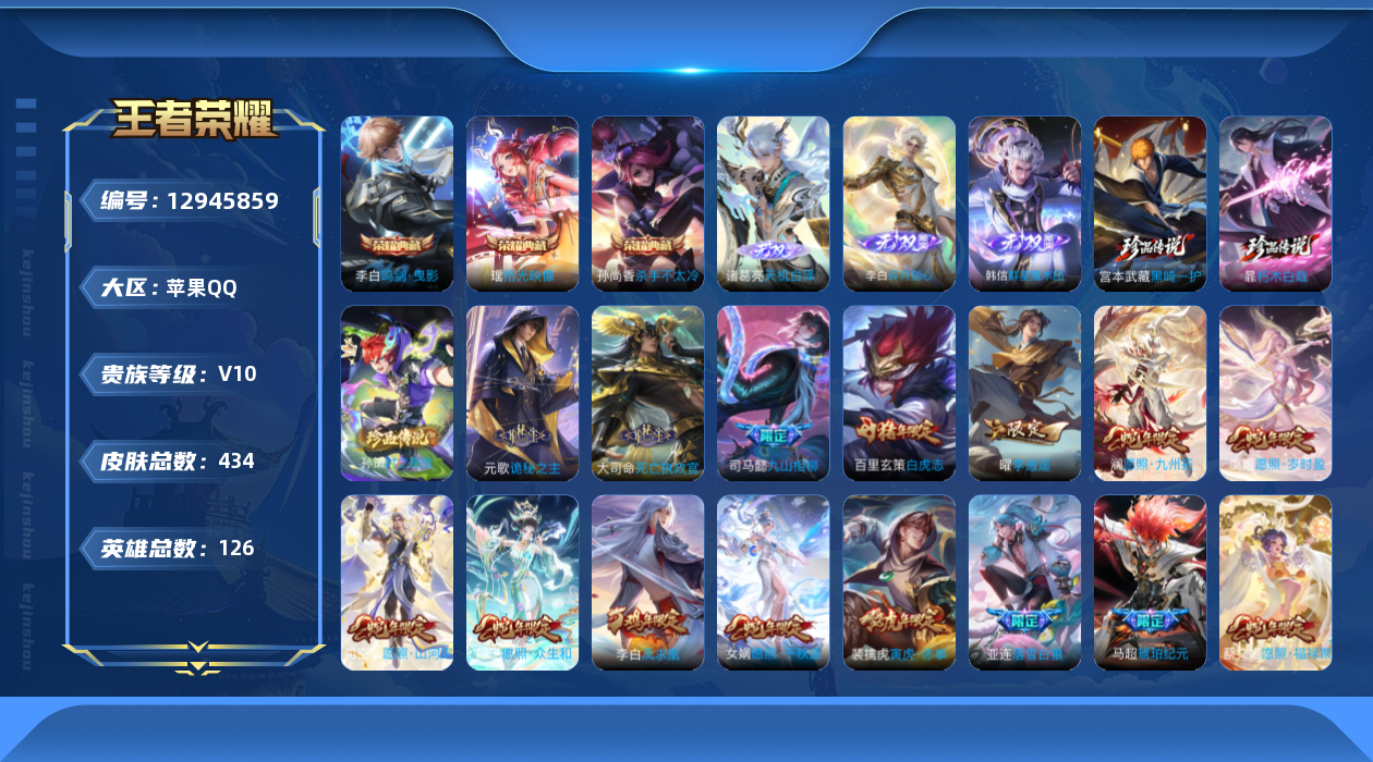 [12945859]打野57段/对抗路36段【特价急出/详情看图】:苹果Q-V10-至尊星耀III段位-126英雄-434皮肤-3典藏-3无双-3珍品传说-47传说-117史诗