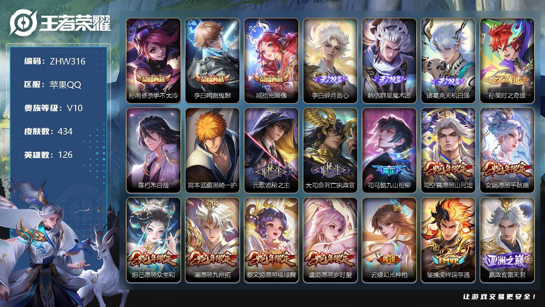[12945859]打野57段/对抗路36段【特价急出/详情看图】:苹果Q-V10-至尊星耀III段位-126英雄-434皮肤-3典藏-3无双-3珍品传说-47传说-117史诗 【荣耀典藏】:孙尚香杀手不太冷,李白鸣剑曳影,瑶拾光映像 【无双皮肤】:李白碎月剑心,韩信群星魔术团,诸葛亮天机白泽 【珍品传说】:孙策时之奇旅,暃朽木白哉,宫本武藏黑崎一护 【传说皮肤】:元歌诡秘之主,大司命死亡执政官,司马懿九山相柳,司空震愿照山河定,女娲愿照千秋盛,妲己愿照众生和,澜愿照九州拓,蔡文姬愿照福禄聚,虞姬愿照岁时盈,云缨幻光神枪,裴擒虎祥瑞亨通,嬴政玄雷天君,桑启鸣野蒿,亚连落雪白狼,吕布曦玄引,貂蝉曦玄引,孙策乘龙淬吴钩,赵云乘龙铭钟鼎,马超琥珀纪元,澜逐花归海,艾琳觅芳踪,李白诗剑行,大乔挚爱花嫁,孙策挚爱之约,蔡文姬花朝如约,孙策末日机甲,裴擒虎寅虎赤拳,王昭君乞巧织情,西施游龙清影,曜李逍遥 ,铠绛天战甲,镜炽阳神光,虞姬启明星使,曜云鹰飞将,李信一念神魔,刘备时之恋人,干将莫邪久胜战神,达摩黄金狮子座,百里玄策白虎志,花木兰冠军飞将,杨戬永曜之星,貂蝉仲夏夜之梦,李白凤求凰,宫本武藏地狱之眼,孙悟空地狱火,吕布天魔缭乱,狄仁杰超时空战士 【限定皮肤】:白起狰,蔡文姬夏日便利店,虞姬夏日便利店,姜子牙天穹之誓,狄仁杰阴阳师,小乔纯白花嫁,虞姬凯尔特女王,赵云皇家上将,赵云龙胆,墨子神迹守卫,嬴政优雅恋人,鲁班七号狮舞东方,庄周蜃楼王,庄周高山流水,高渐离死亡摇滚,高渐离玩趣恶龙,阿轲迷踪丽影,孙膑妖精王,扁鹊炼金王,扁鹊奇幻香踪,白起夜都怪侠,芈月重明,芈月幻夜卜梦,吕布天魔缭乱,吕布猎兽之王,周瑜真爱至上,元歌云间偶戏,夏侯惇朔风刀,曹操烛龙,典韦穷奇,马可波罗逐梦之星,马可波罗暗影游猎,狄仁杰魔术师,狄仁杰万华元夜,达摩星际陆战队,达摩沙漠行僧,项羽海滩派对,老夫子醍醐杖,老夫子航海奇遇记,关羽冰锋战神,程咬金演武夺筹,刘邦夺宝奇兵,韩信逐梦之影,韩信飞衡,韩信傲雪梅枪,王昭君凤凰于飞,兰陵王金庭之子,花木兰青春决赛季,亚瑟狮心王,亚瑟潮玩骑士王,孙悟空至尊宝,牛魔御旌,后羿如梦令,后羿圣弓游侠,李元芳云中旅人,虞姬启明星使,钟馗神迹守卫,钟馗驱傩正仪,杨戬永曜之星,干将莫邪真爱魔法,雅典娜单词大作战,雅典娜黎明之约,蔡文姬繁星吟游,太乙真人饕餮,鬼谷子原初探秘者,鬼谷子五谷丰年