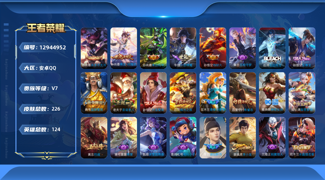 [12944952]发育路34段【特价急出/详情看图】:安卓Q-V7-至尊星耀V段位-124英雄-226皮肤-1典藏-4传说-64史诗