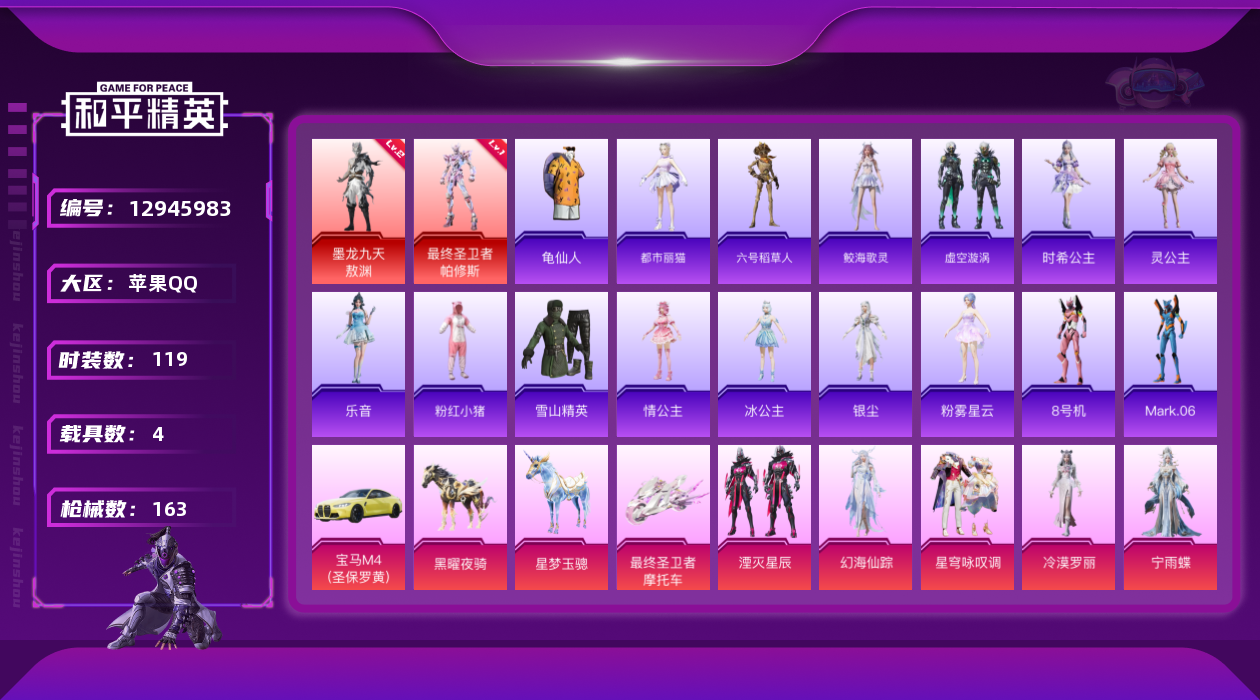 [12945983]绝世印记1【暑期末清货/特价急出/永久包赔】:苹果 手Q-2红装-6粉装-11特效枪-4载具-6.1w热力值-6印记-119套装-163枪皮【热门品类】:套装-SS1特训【角色神装等级】:最终圣卫者-帕修斯(一级),墨龙九天-敖渊(二级)【稀有载具】:宝马M4(圣保罗黄),最终圣卫者摩托车,星梦玉骢,黑曜夜骑【特效枪等级】:AKM-炫紫旋律(一级),AKM-幻海仙踪(五级),M416-墨龙九天(一级),M416-灵猫魔法师(六级),Vector-最终圣卫者(三级),AKS-74U-星穹咏叹调(一级),Kar98K-巳巳如意(五级),AWM-湮灭星辰(五级),DP-28-豹影疾电(一级),破片手榴弹-瓶中星球(一级)【优质套装】:角色-初号机 觉醒Ver.,角色-幻海仙踪,粉装-星穹咏叹调,粉装-湮灭星辰,角色-冷漠罗丽,角色-宁雨蝶【优质飞行器】:龙翔九天飞行器,幻海精灵飞行器,幻海仙踪飞行器,终晖之翼飞行器,灵猫魔法师飞行器