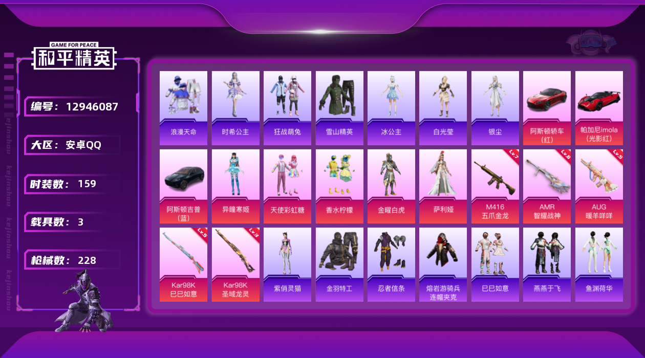 [12946087]特价急出!安卓 手Q-6粉装-5特效枪-3载具-2粉色飞行器-67028热力值-6王牌印记-159套装-228枪皮