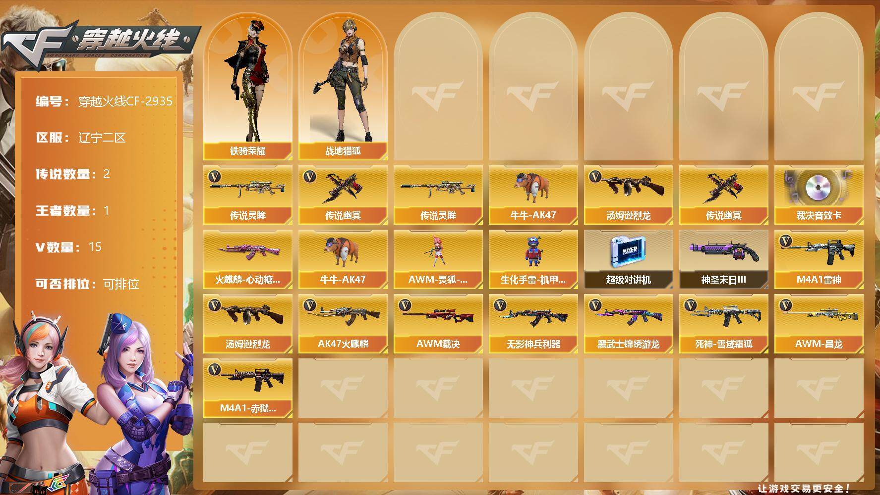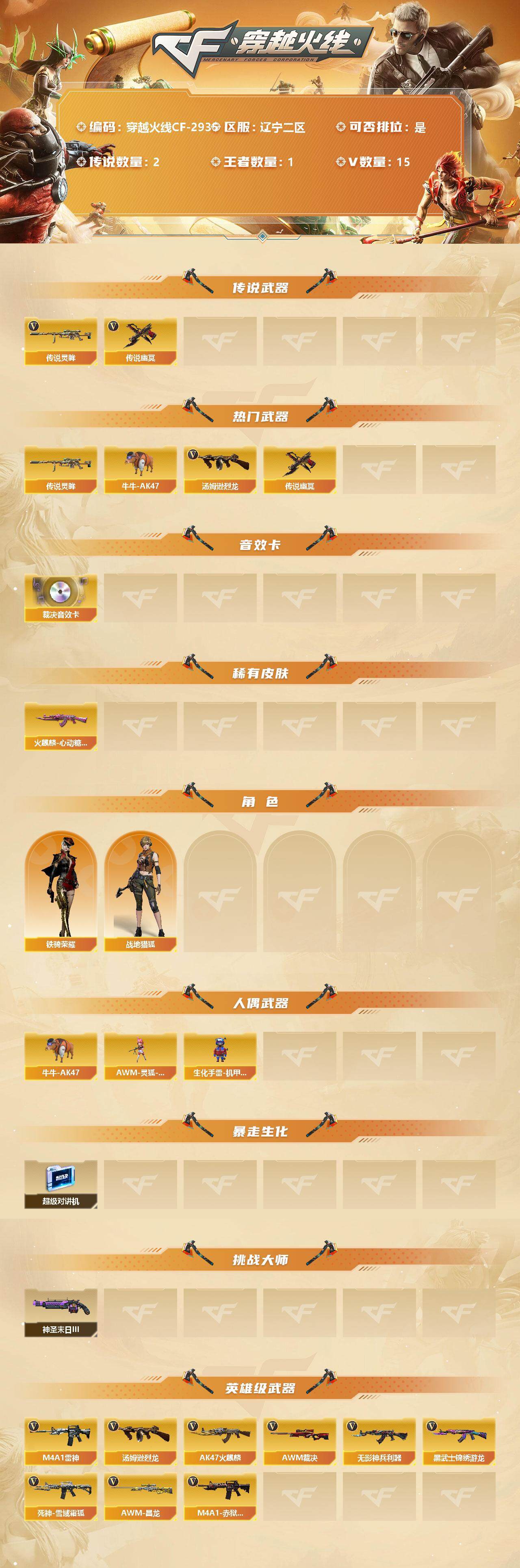 [12946708]辽宁二区-15V-1王者-0炫金 【传说武器】:传说灵眸,传说幽冥 【热门武器】:传说灵眸,传说幽冥,牛牛-AK47,汤姆逊-烈龙 【音效卡】:AWM-裁决音效卡 【稀有皮肤】:火麒麟-心动糖果 【角色】:战地猎狐,铁骑荣耀 【人偶武器】:AWM-灵狐-15周年嘉年华*2,牛牛-AK47,生化手雷-机甲核心 【暴走生化】:超级对讲机 【挑战大师】:神圣爆裂者-末日III 【英雄级武器】:无影-神兵利器,M4A1-雷神,汤姆逊-烈龙,AK47-火麒麟,AWM-裁决,黑武士-锦绣游龙,死神-雪域霜狐,AWM-昌龙,M4A1-赤狱骑士 【特殊枪械】:1烈龙