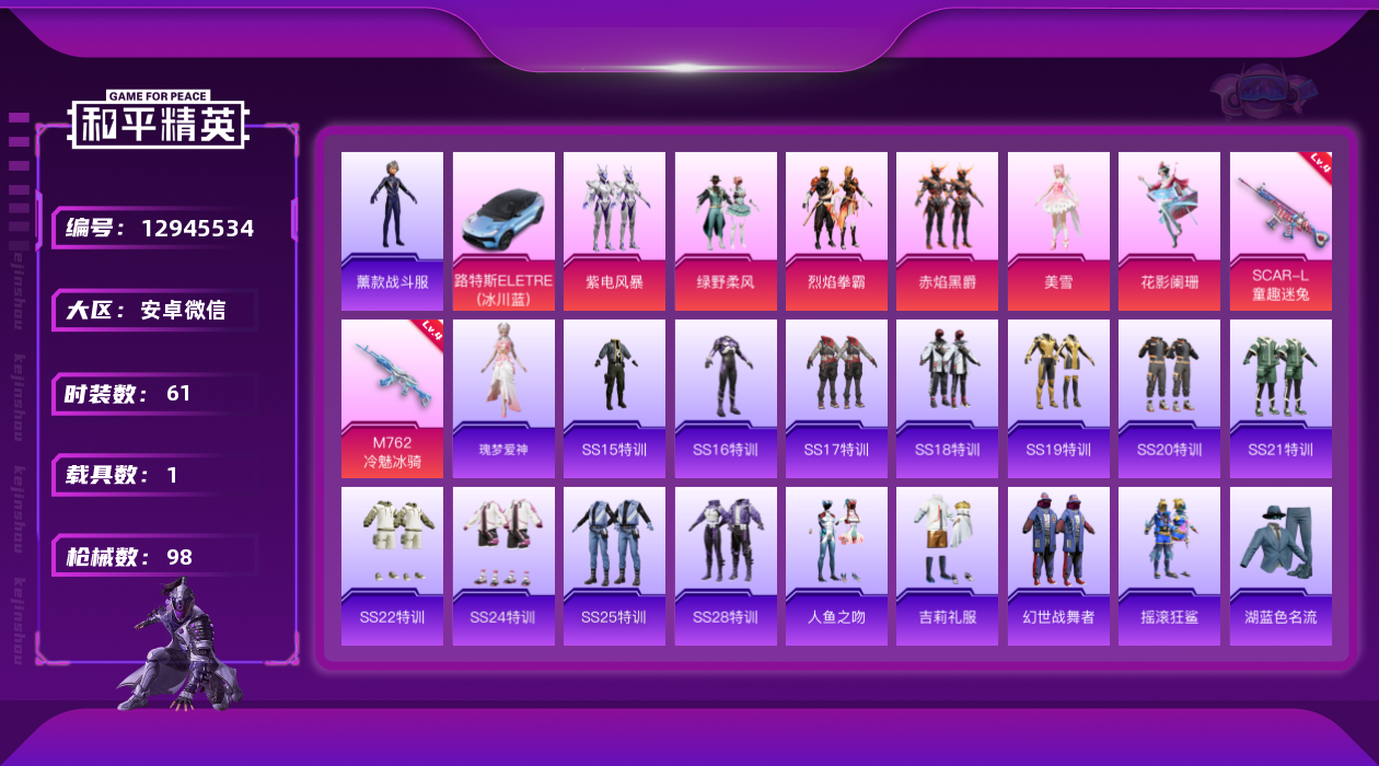- [12031532]4粉装 3特效枪 2载具 4印记 可二次 可修改实名 优质装备:玛莎拉蒂Quattroporte(夜幕蓝),迈凯伦570S(天际蓝),AKM炫紫旋律,梦幻火箭(新101)(新火箭少女101粉色套装),绚金战神,SCAR-L纯梦嫁纱 热门装扮:复仇流浪者,挚爱序曲,梦魇先生 稀有枪皮:DP-28-豹影疾电 六级特效枪:六级SCAR-L-纯梦嫁纱 五级特效枪:五级DP-28-豹影疾电 四级特效枪:四级AKM-炫紫旋律 紫色装扮:SS22特训,SS23特训,幻彩翩翩,妙红点点,龙舌兰冰茶,SS21特训,SS31特训套装,冰川特警,冷焰舞者,SS30特训套装,SS20特训,吉莉礼服,长空猛禽,雨林探路者,霓虹街区,魅力单车,麻辣教官,黑色伏地魔,龙的传人,龟仙人,极地朋克,派对绅士,清新柠檬,幻世战舞者,绮丽涂鸦,破蛋小黄鸡,福星高照,空岛之星,牛气冲天,牛气满满,猛禽,特殊使命,特训学院,鱼渊荷华,都市丽猫,青团波波,糖糖葫芦,竞技名士,深海梦境,惊鸿侠骨,SS25特训,锦衣飞扬,SS27特训,SS26特训,耀粉歌者,SS32特训服(SS32特训套装),青玉碎影,绯格组合 优质战备:千金淑猫降落伞,环太平洋降落伞,纯梦嫁纱降落伞,仲夏莫吉托降落伞,梦幻火箭降落伞,飞行器-炫紫旋律,炫紫旋律降落伞