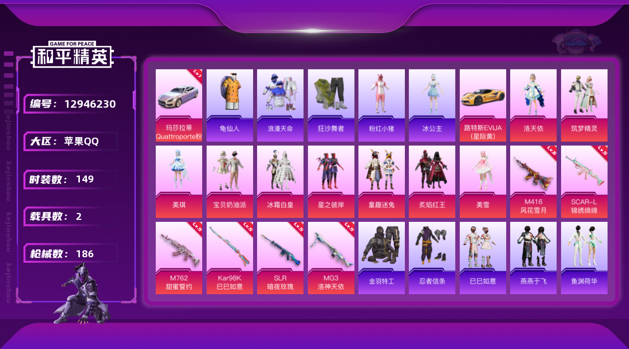 [12946230]扭蛋碎片699【暑期末清货/特价急出/永久包赔/商品详情看图】:苹果 手Q-9粉装-6特效枪-2载具-6.6w热力值-9印记-149套装-186枪皮【热门品类】:套装-奇异狩猎者,套装-金羽特工,套装-忍者信条【稀有载具】:路特斯EVIJA(星际黄),玛莎拉蒂Quattroporte(幻星粉)【稀有载具等级】:玛莎拉蒂Quattroporte(幻星粉)(一级)【特效枪等级】:SCAR-L-锦绣绵绵(五级),M416-风花雪月(六级),M762-甜蜜誓约(五级),Kar98K-巳巳如意(五级),SLR-暗夜玫瑰(五级),MG3-洛神天依(五级)【优质套装】:粉装-宝贝奶油派,粉装-冰霜白皇,粉装-童趣迷兔,粉装-炙焰红王,粉装-星之彼岸,角色-洛天依,粉装-筑梦精灵,角色-美雪,角色-美琪【优质飞行器】:童趣迷兔飞行器